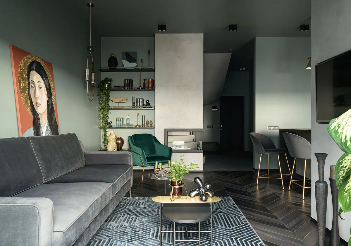 Intérieur moderne et original d'une appartement deux étages en tons verts à Kiev (97 m²)