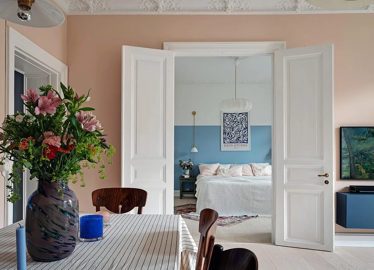 Rouge et bleu pâle : appartement pastel en Suède (77 m²)