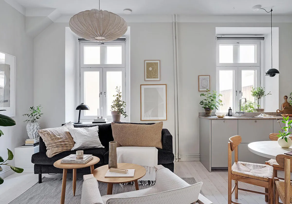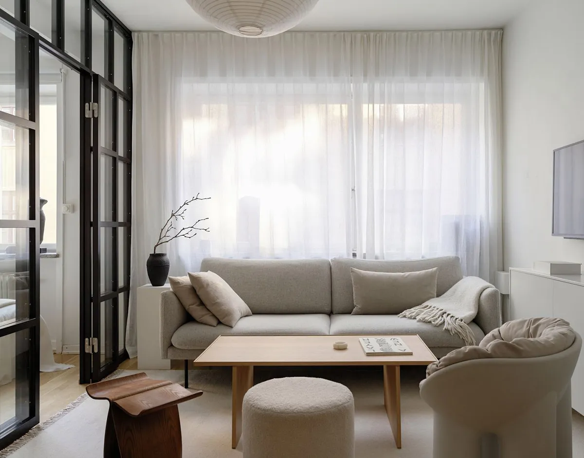 Style minimaliste doux et cloison de verre : petite appartement à Stockholm (39 m²)
