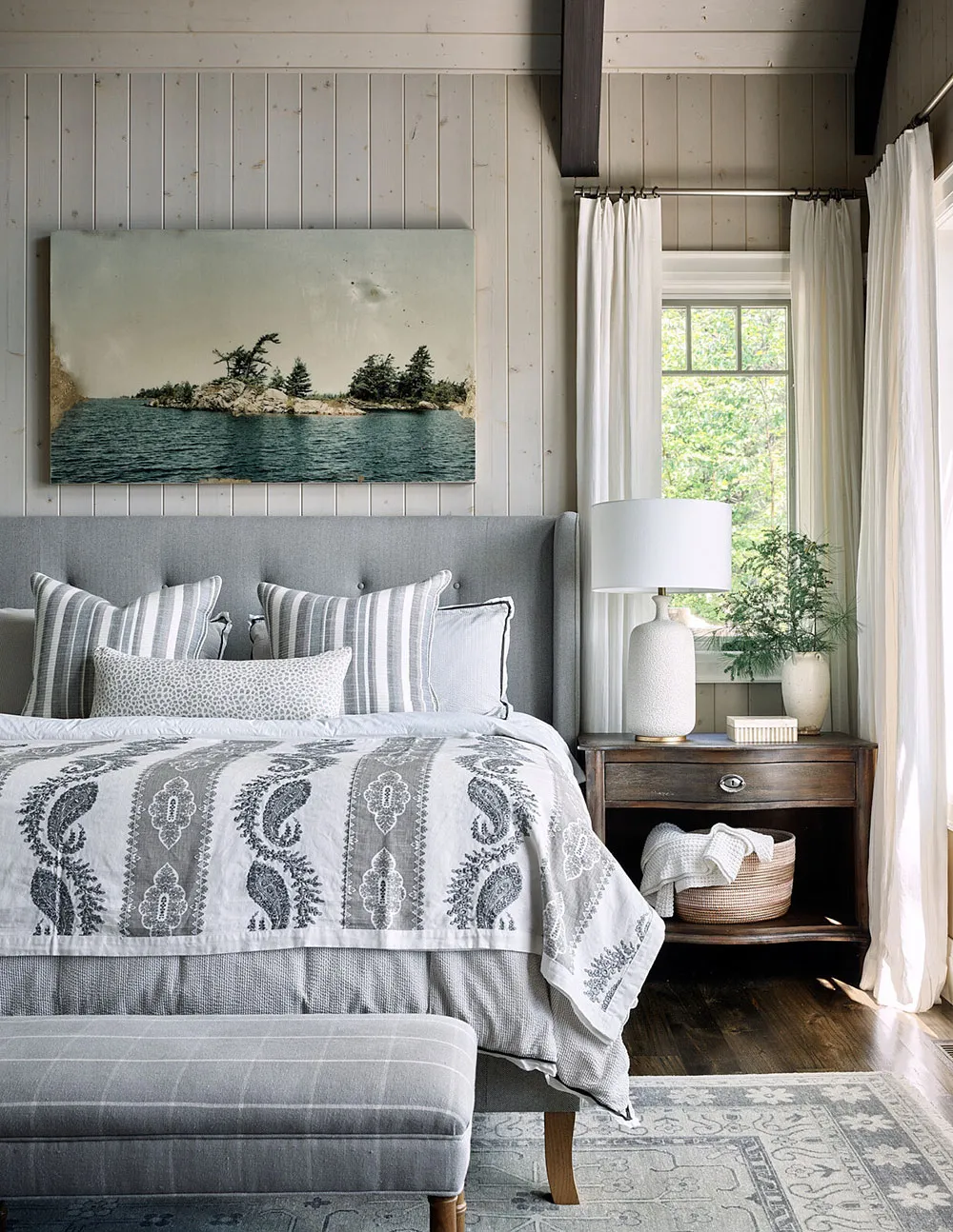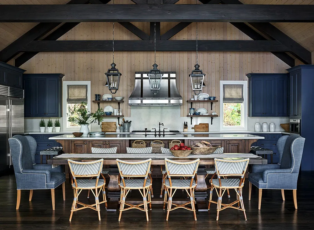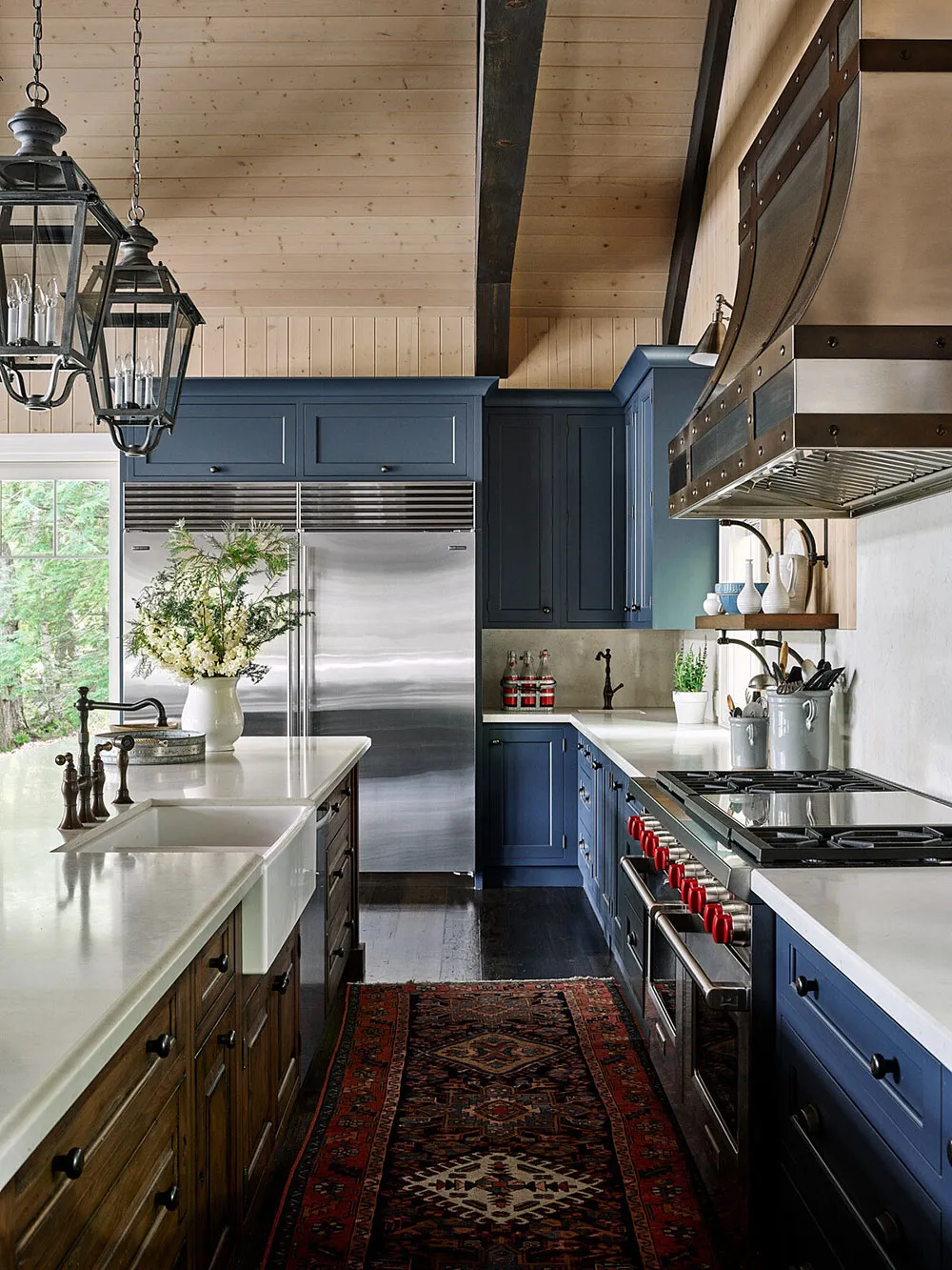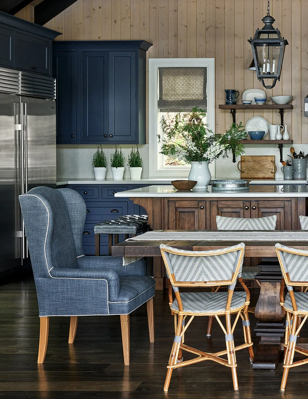 Cuisine bleue et joli textile : une maison confortable au bord du lac au Canada