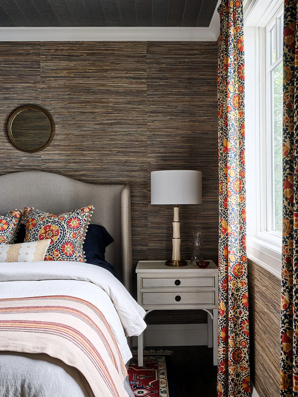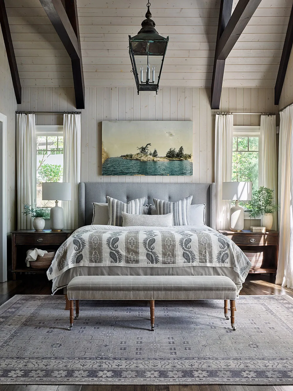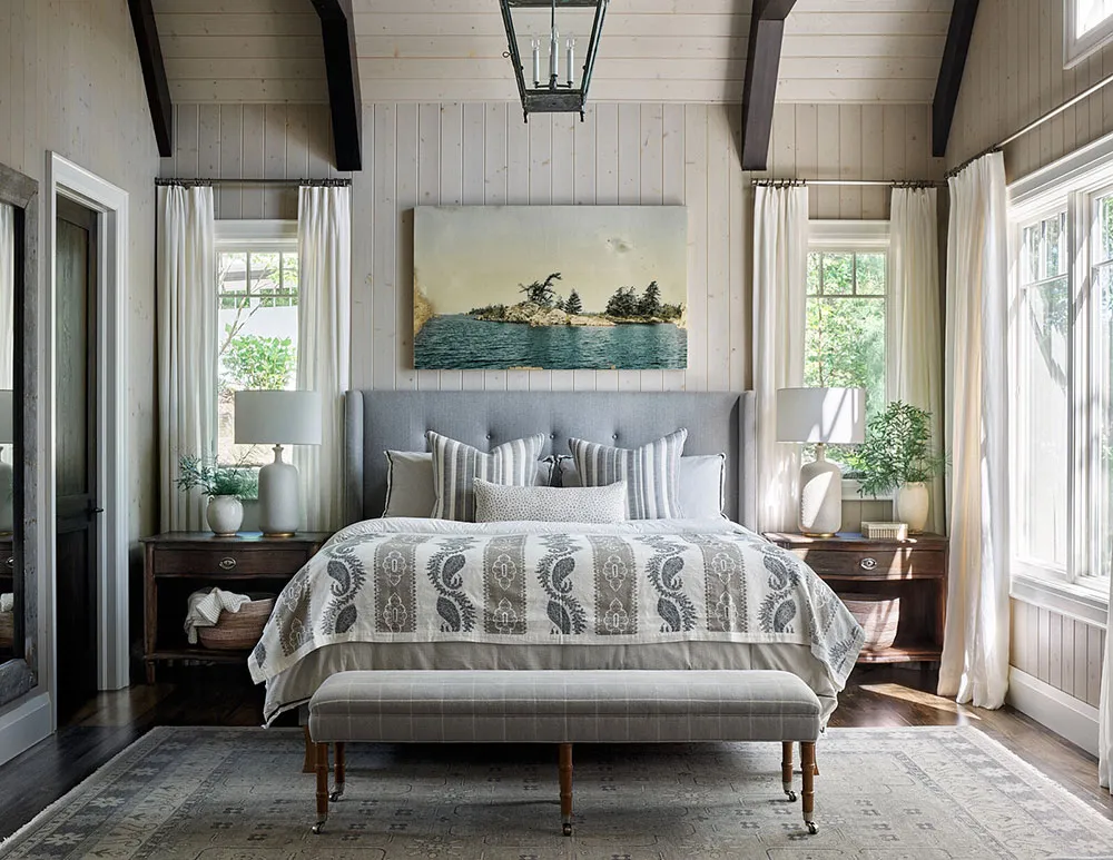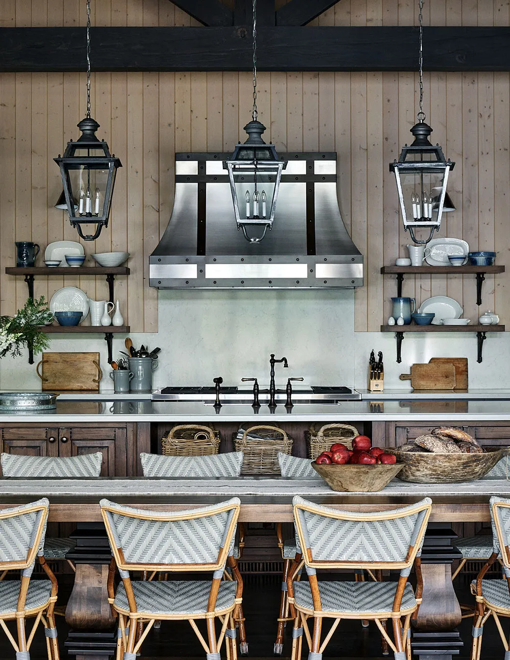 Cuisine bleue et joli textile : une maison confortable au bord du lac au Canada