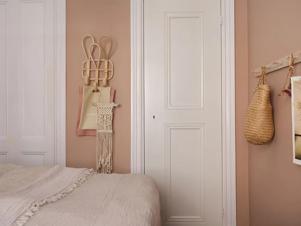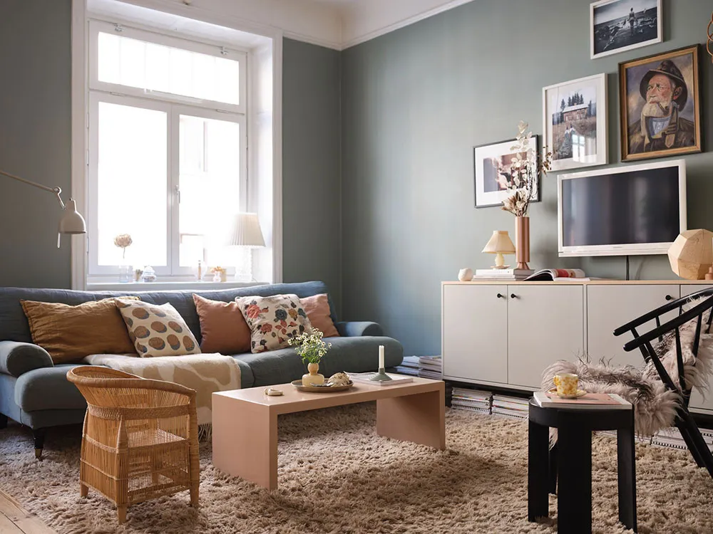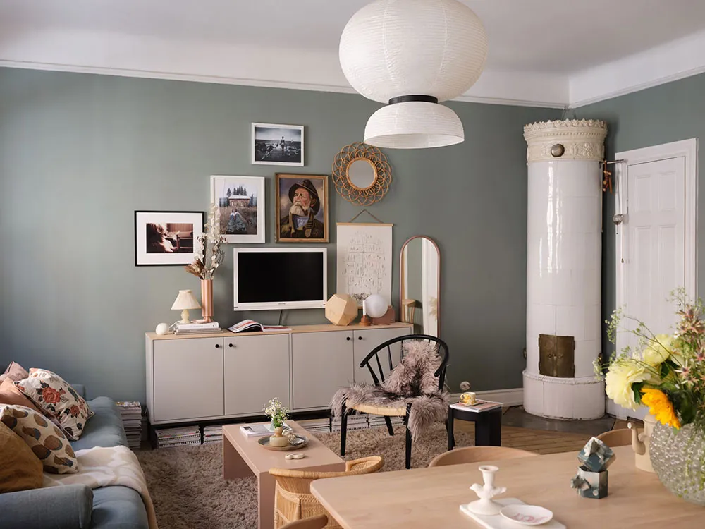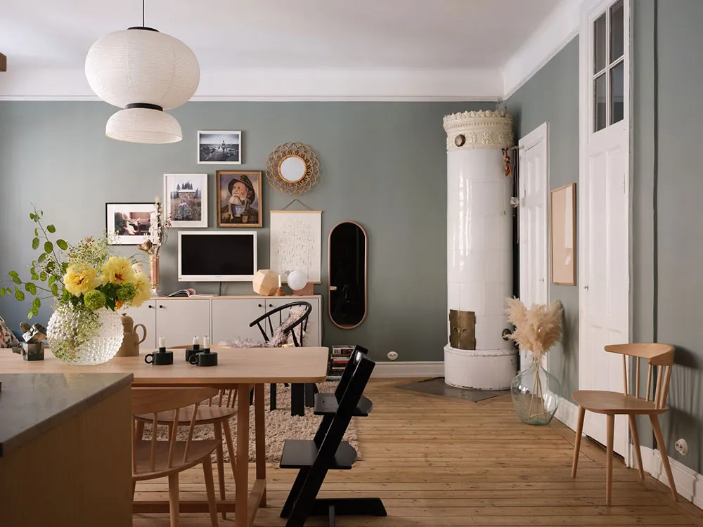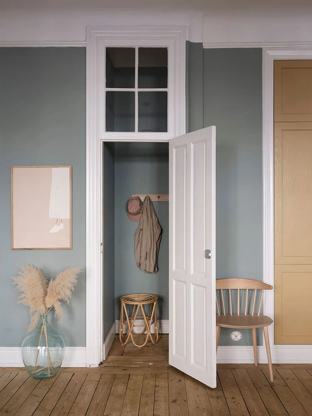 Salle d'attente rose avec un canapé bleu : une petite appartement scandinave dans une maison centenaire (105 m²)