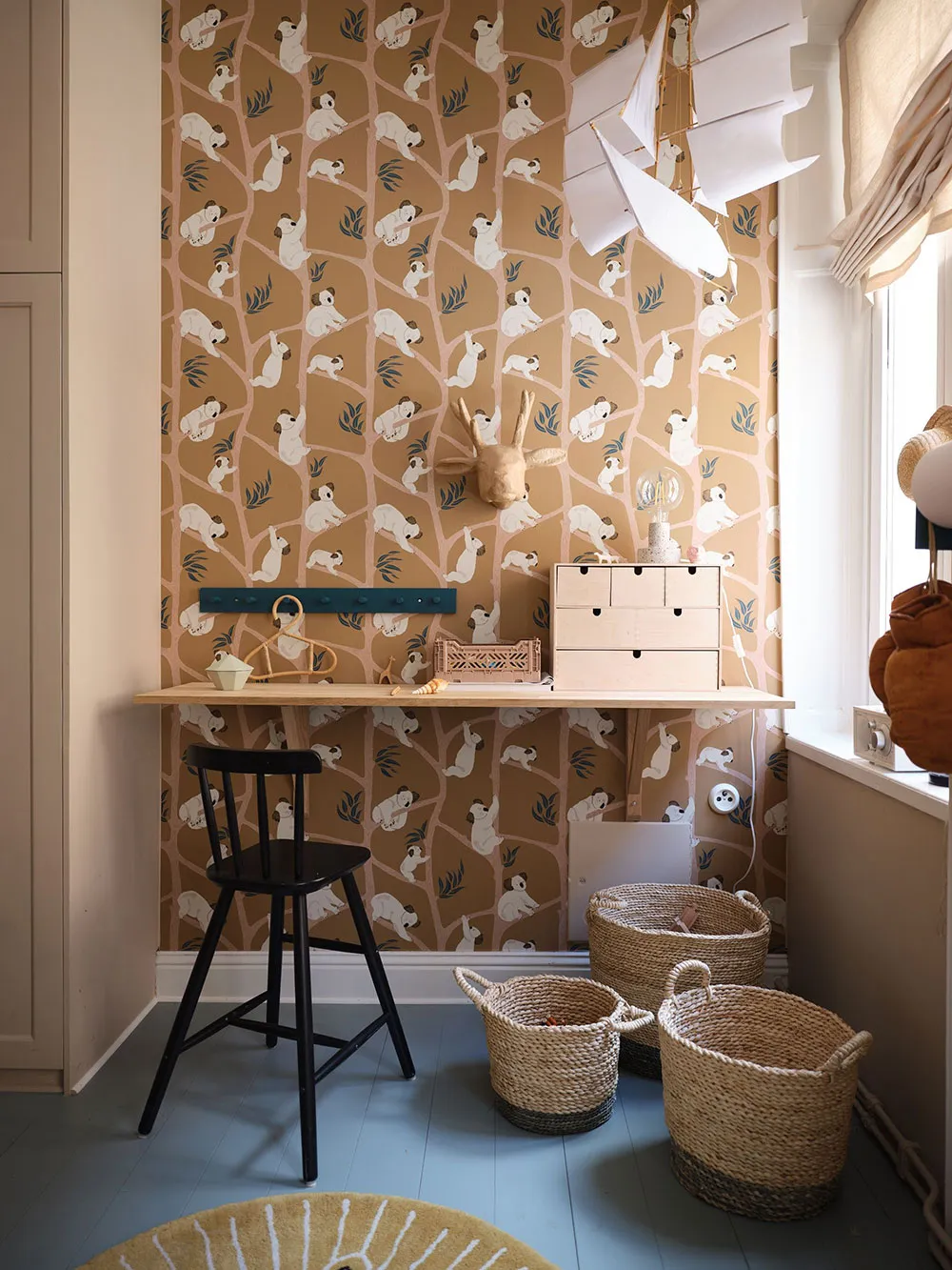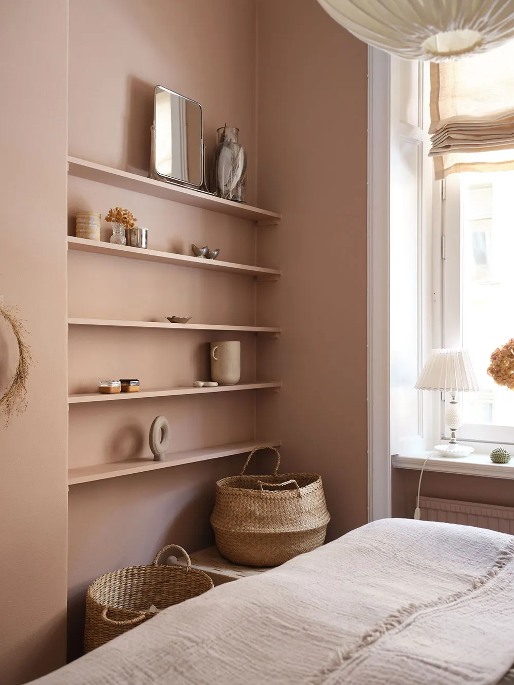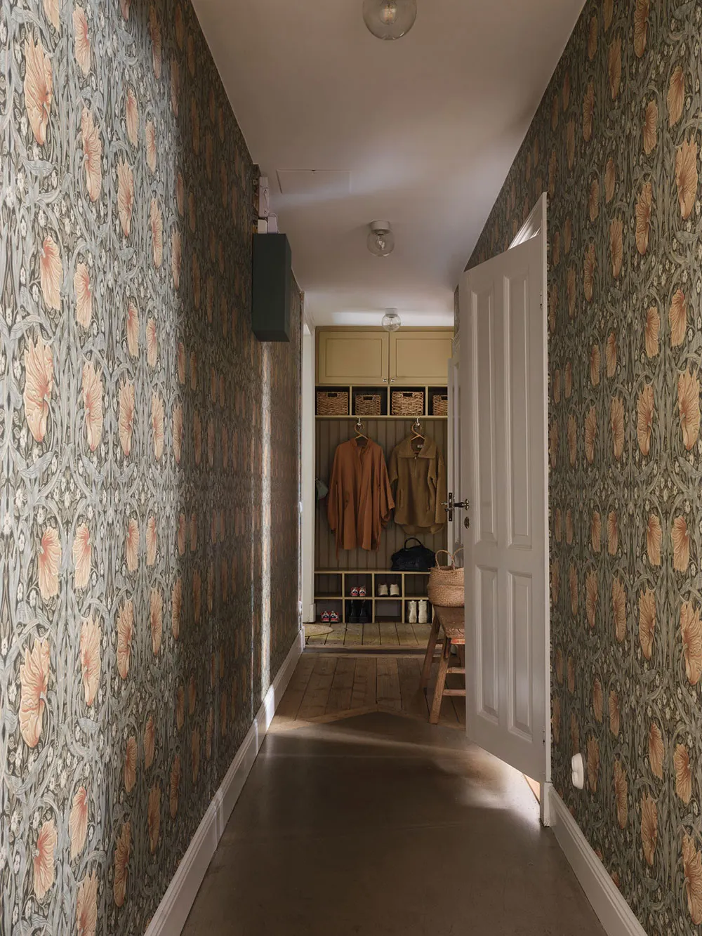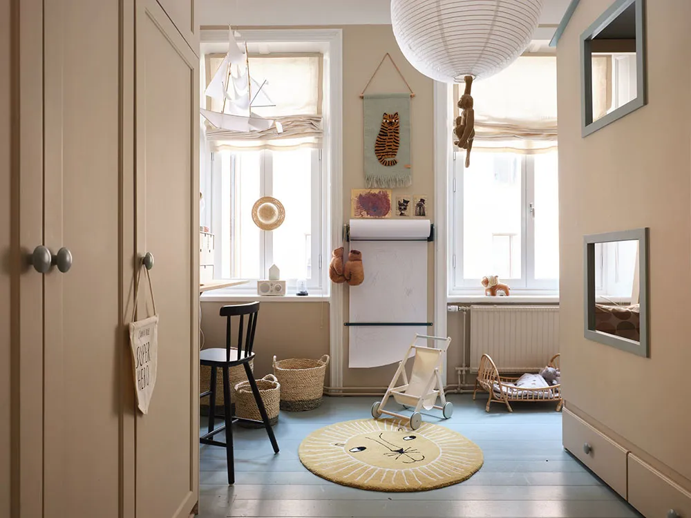 Salle d'attente rose avec un canapé bleu : une petite appartement scandinave dans une maison centenaire (105 m²)