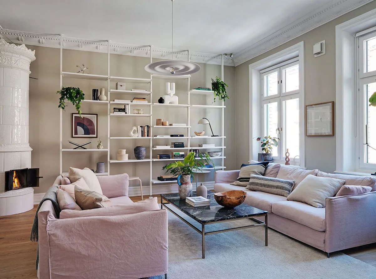 Canapé rose et cuisine noire : appartement coloré à Göteborg (99 m²)