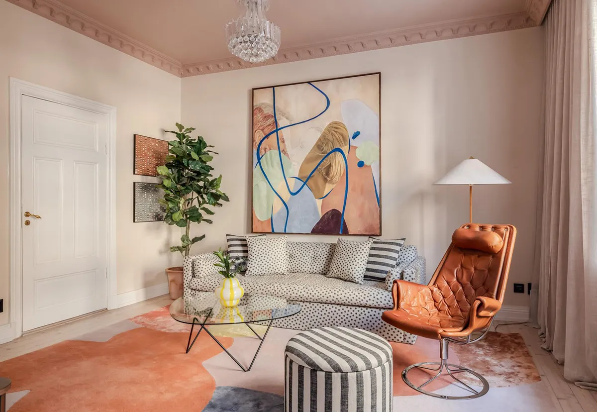 Plafond rose et canapé tacheté : un appartement lumineux à Stockholm (61 m²)