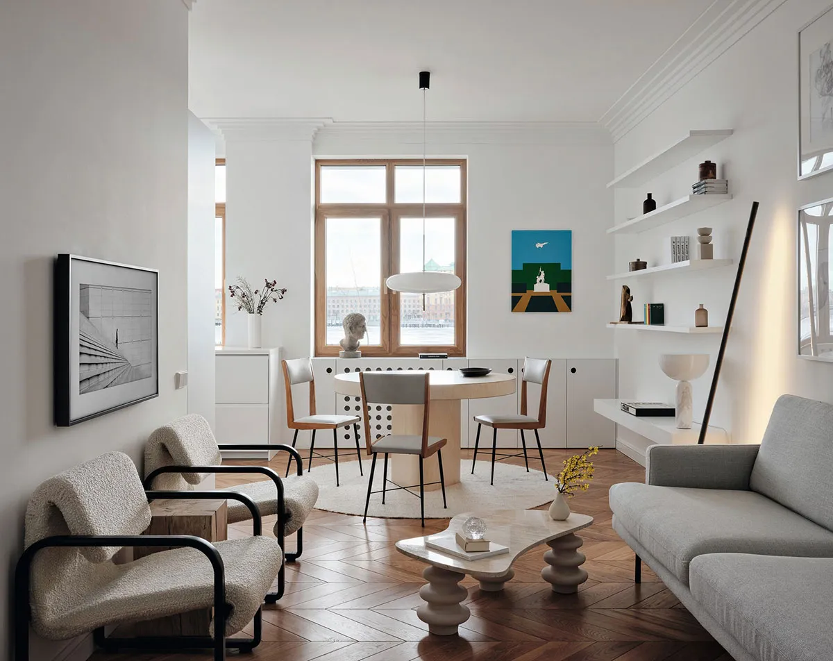 Style blanc élégant avec mélange de vieillisme et modernité au centre de Saint-Pétersbourg (85 m²)