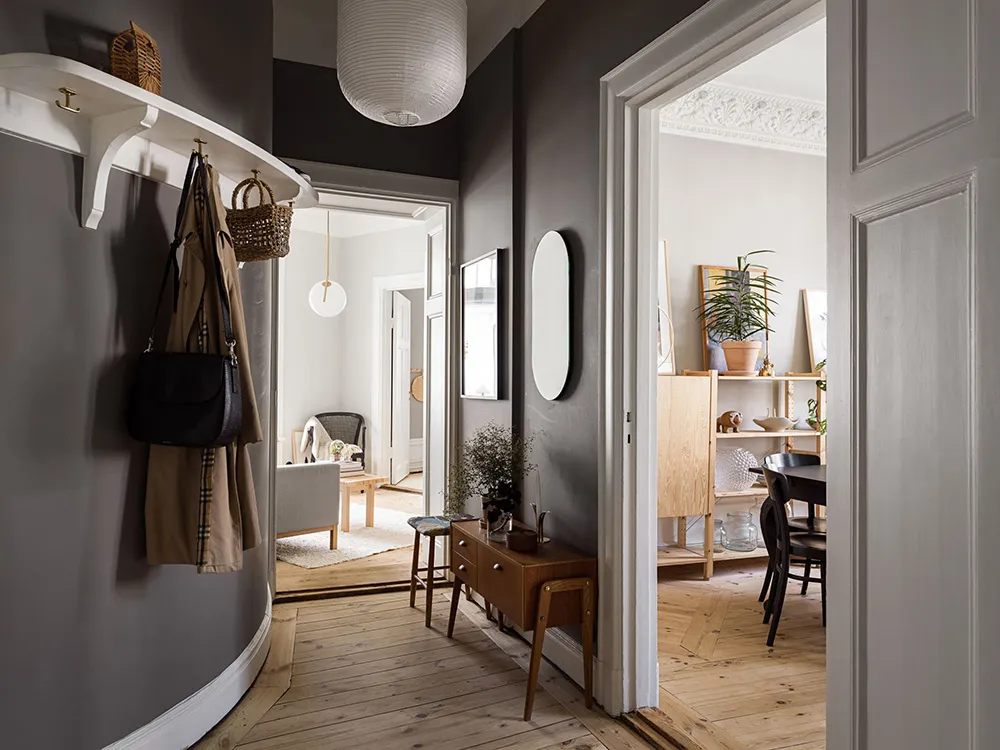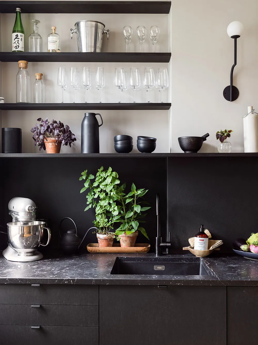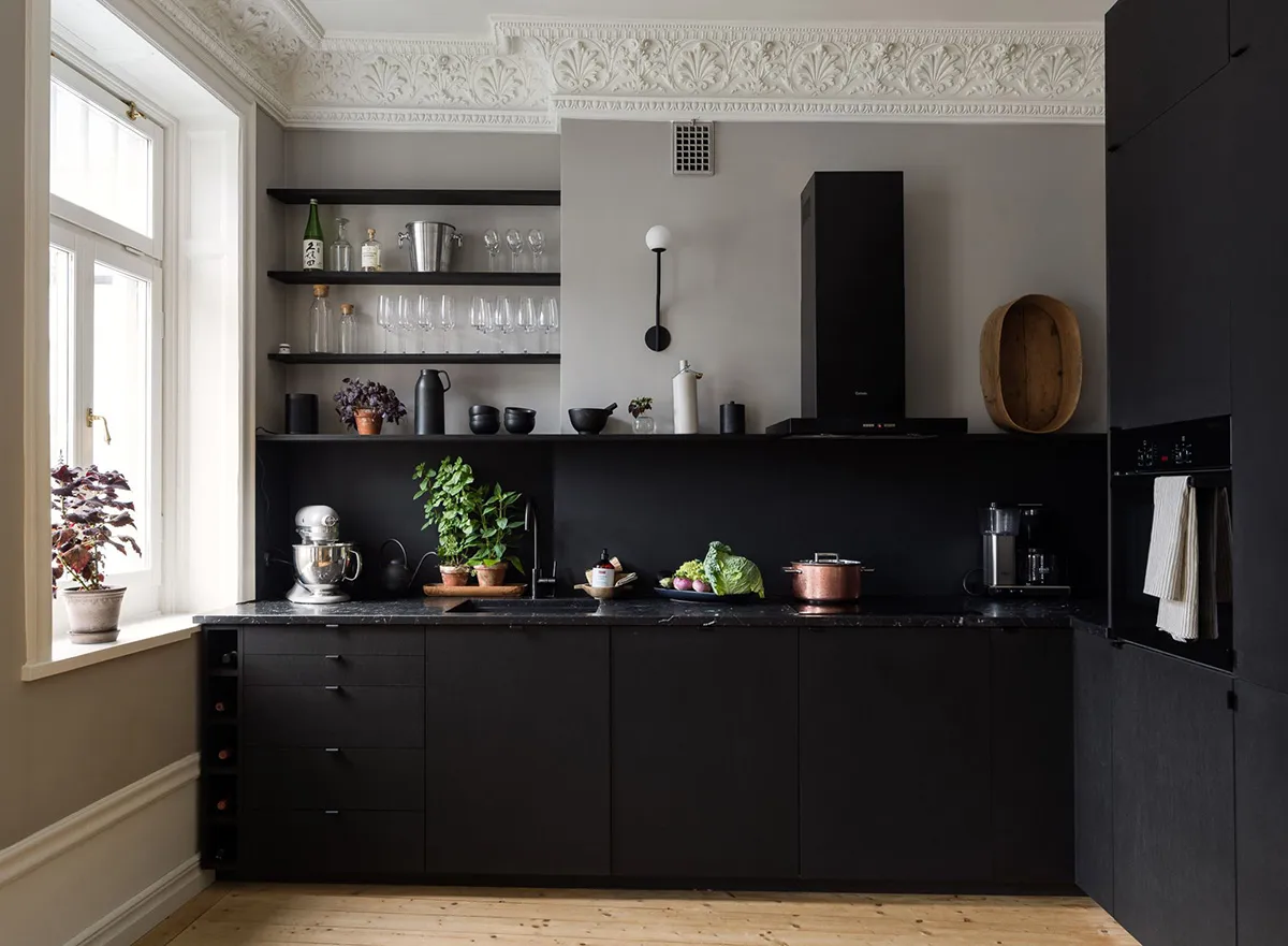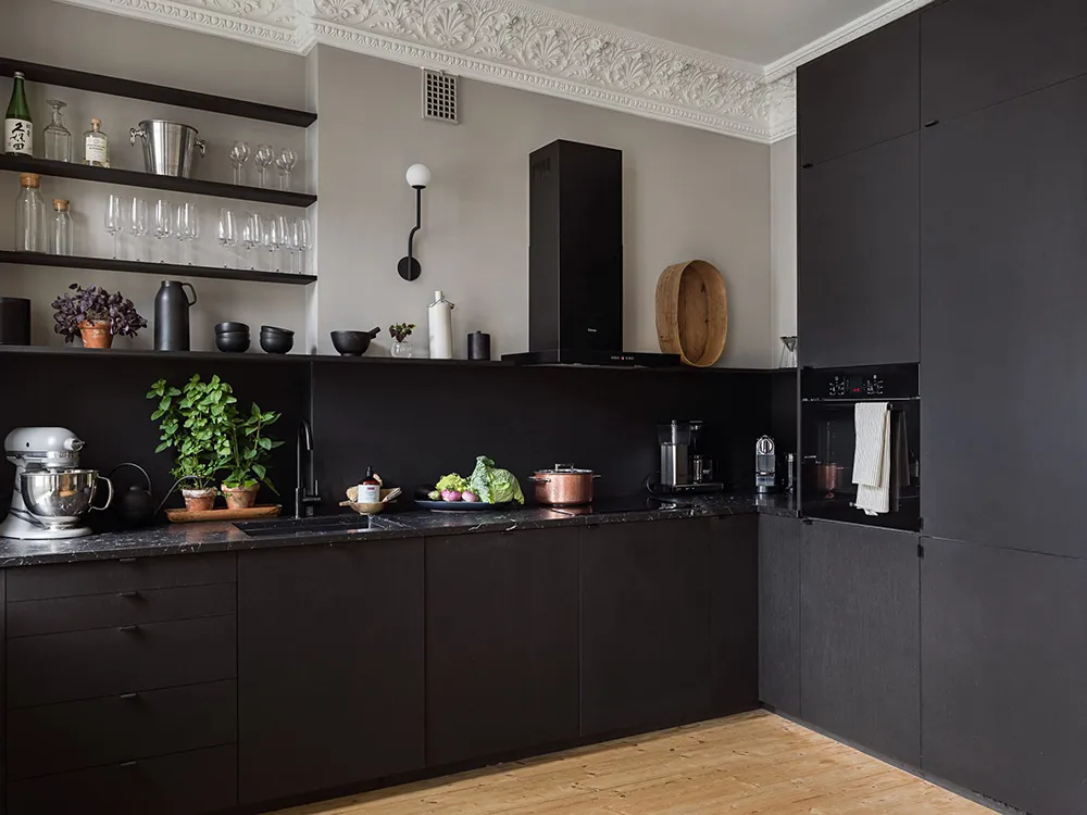 Planification complexe et cuisine noire élégante : petite appartement à Stockholm (55 m²)