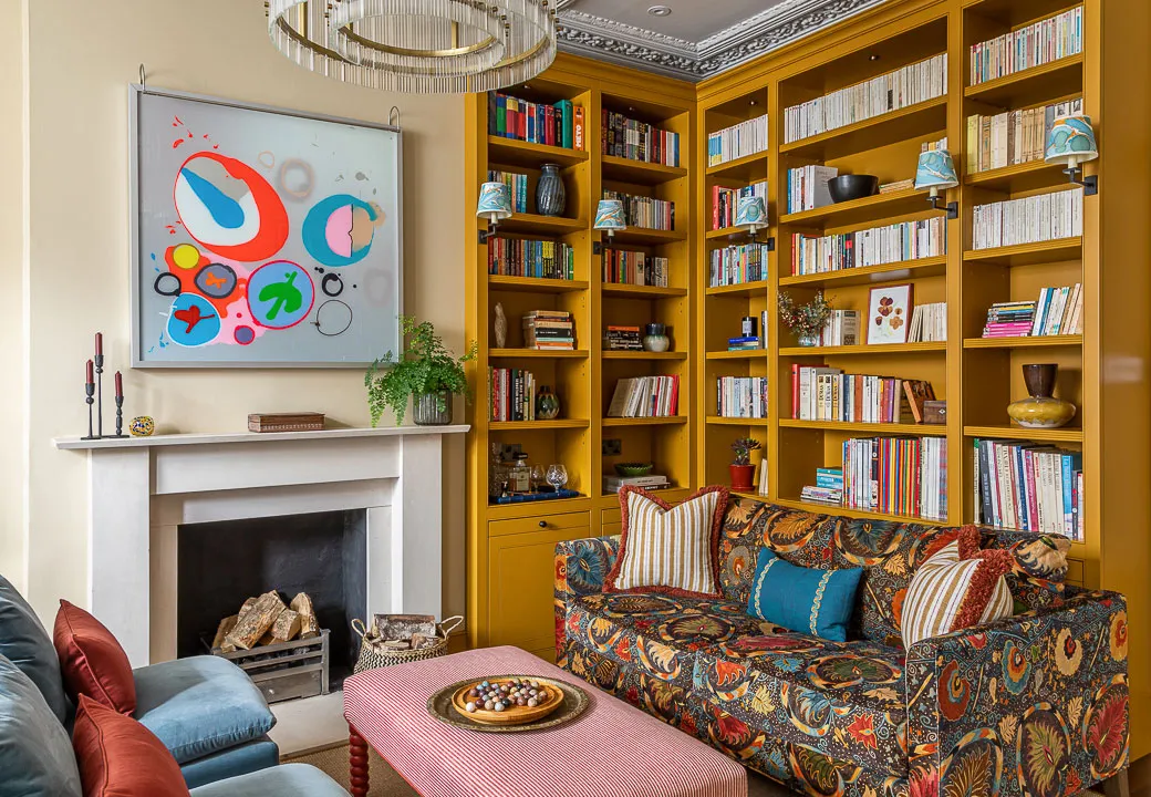 Étagère jaune et autres détails colorés dans le design intérieur à Londres