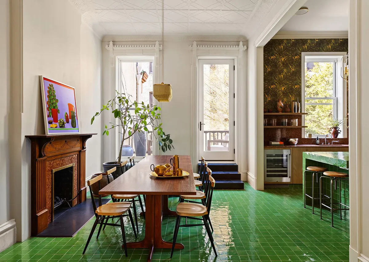 Pierre verte et autres accents colorés dans le design d'une maison de ville à Brooklyn