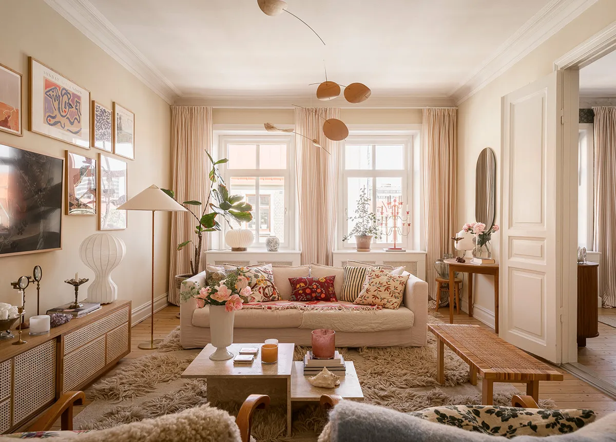 Intérieur beige à Gétteborg avec des détails floraux chaleureux