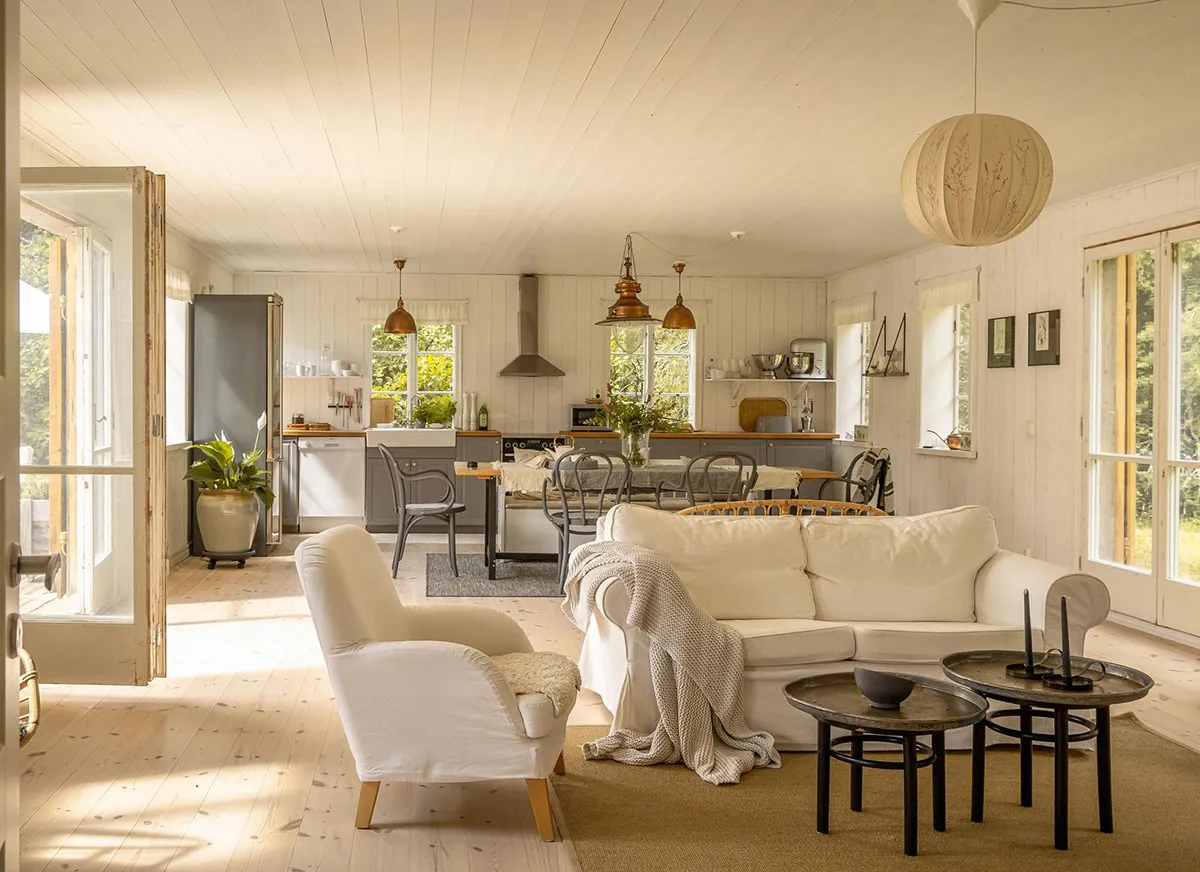 Intérieur scandinave chaud et cosy dans un ancien hangar en Suède