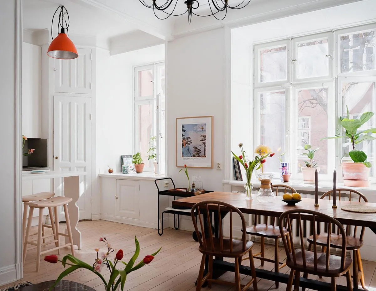 Jolie appartement scandinave avec canapé rose et cuisine blanche (49 m²)