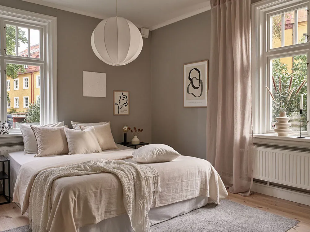 Intérieur beige doux dans un appartement d'une maison de campagne historique en Suède