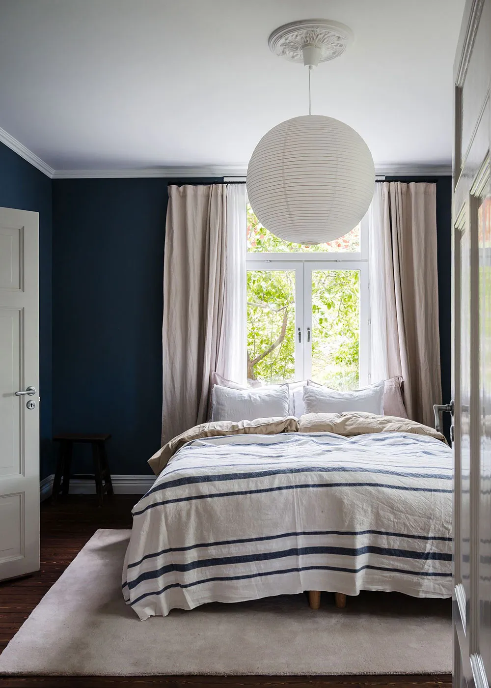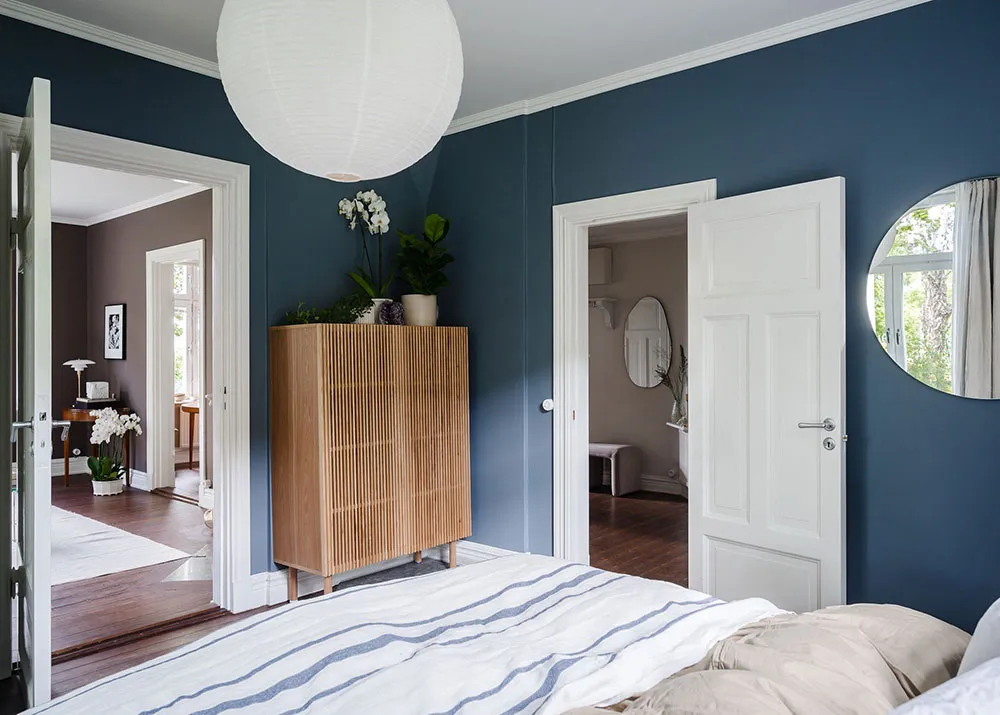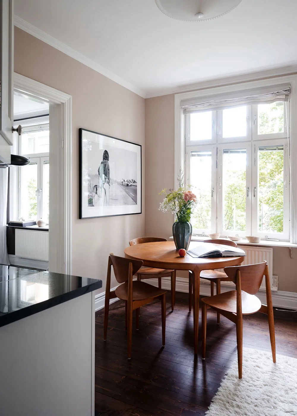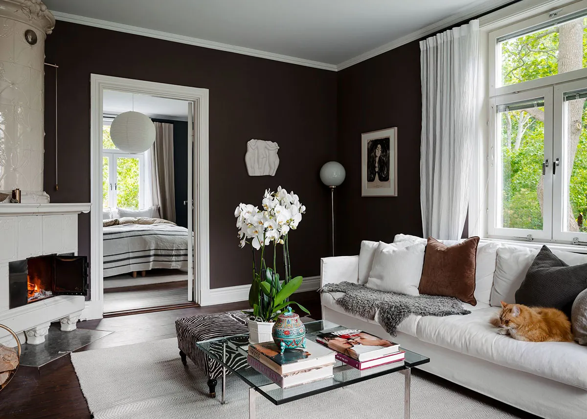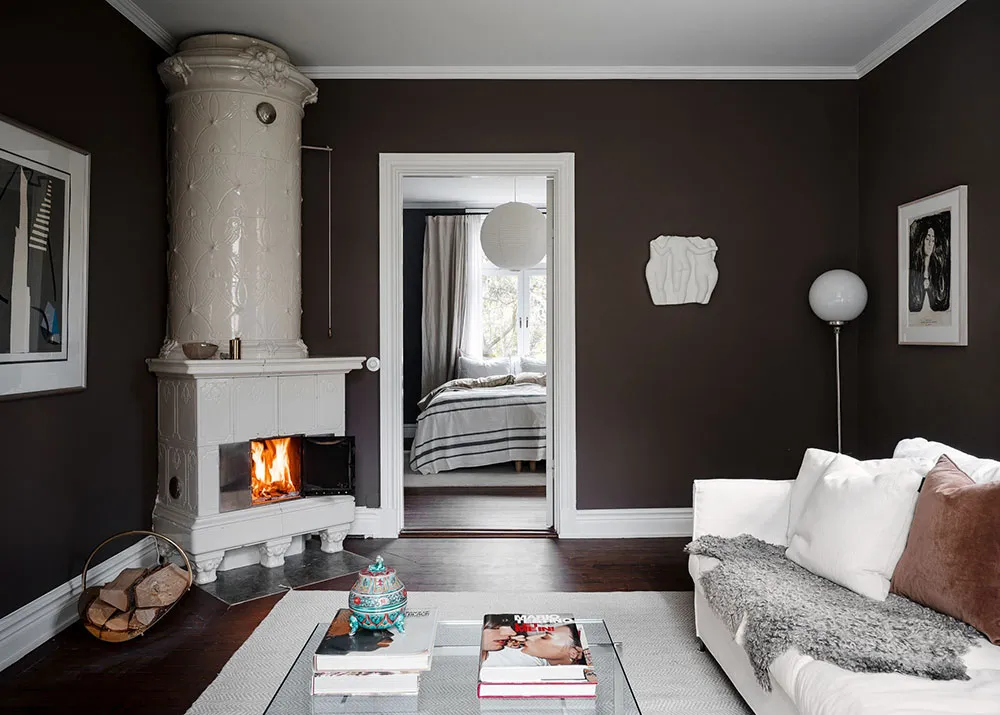Murs en chocolat dans un appartement scandinave cosy de 59 m²