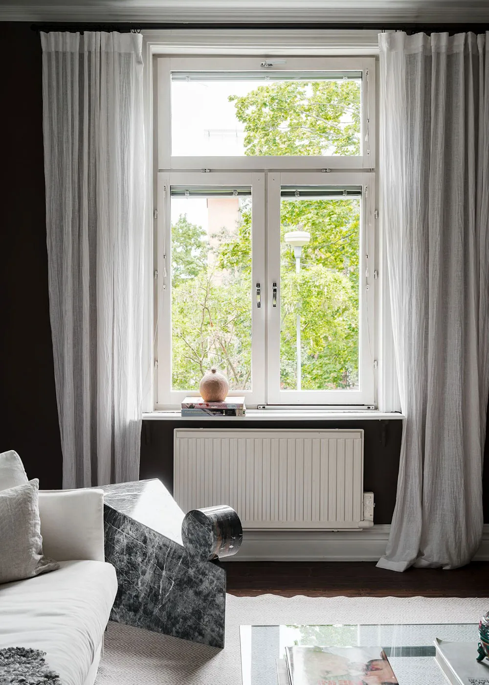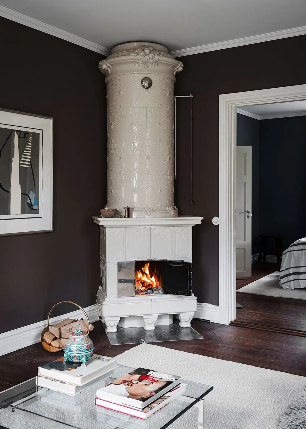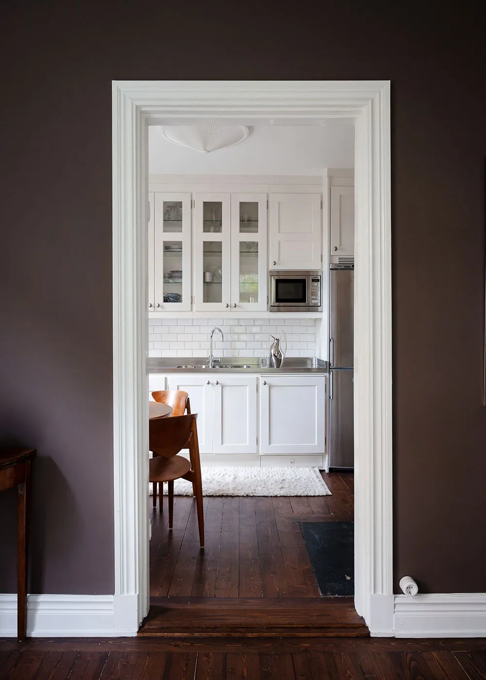 Le salon de cet petit appartement de deux pièces situé en périphérie de Stockholm ressemble à un morceau de chocolat : les murs brun foncé avec une bordure blanche sur les portes et fenêtres rappellent véritablement la tablette de chocolat au lait.