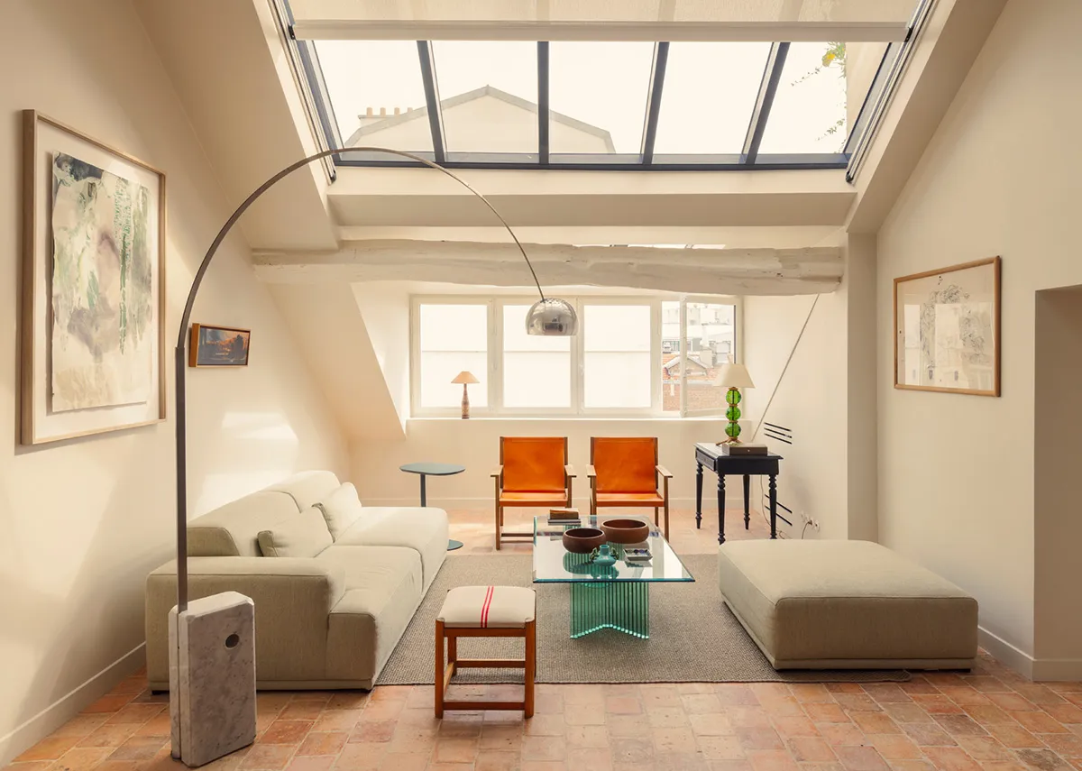 Loft ensoleillé dans un bâtiment historique à Paris avec un décor moderne élégant