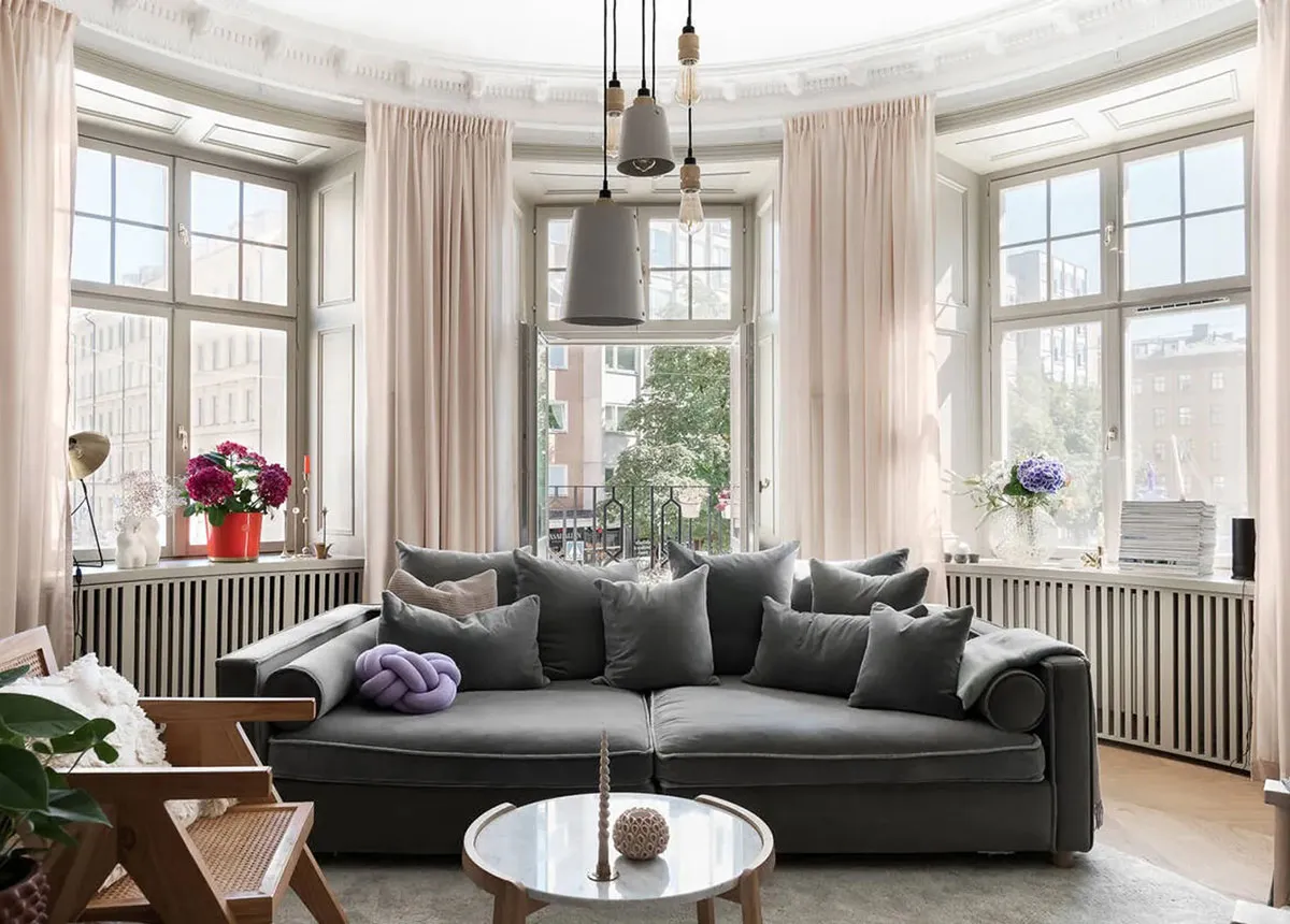 Salle de séjour ronde, décoration murale luxueuse, meubles élégants : appartement à Stockholm