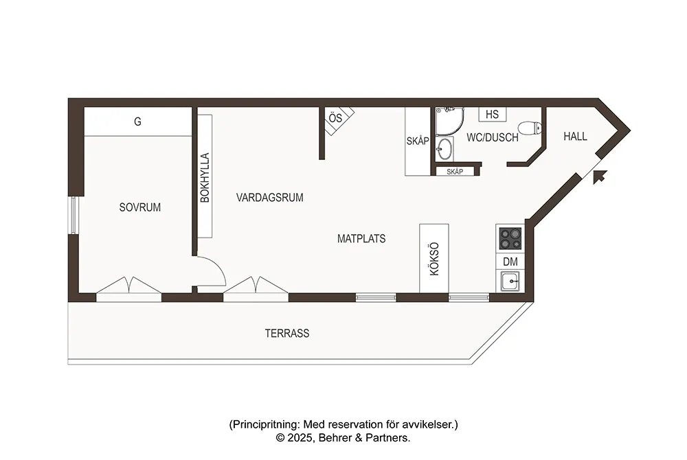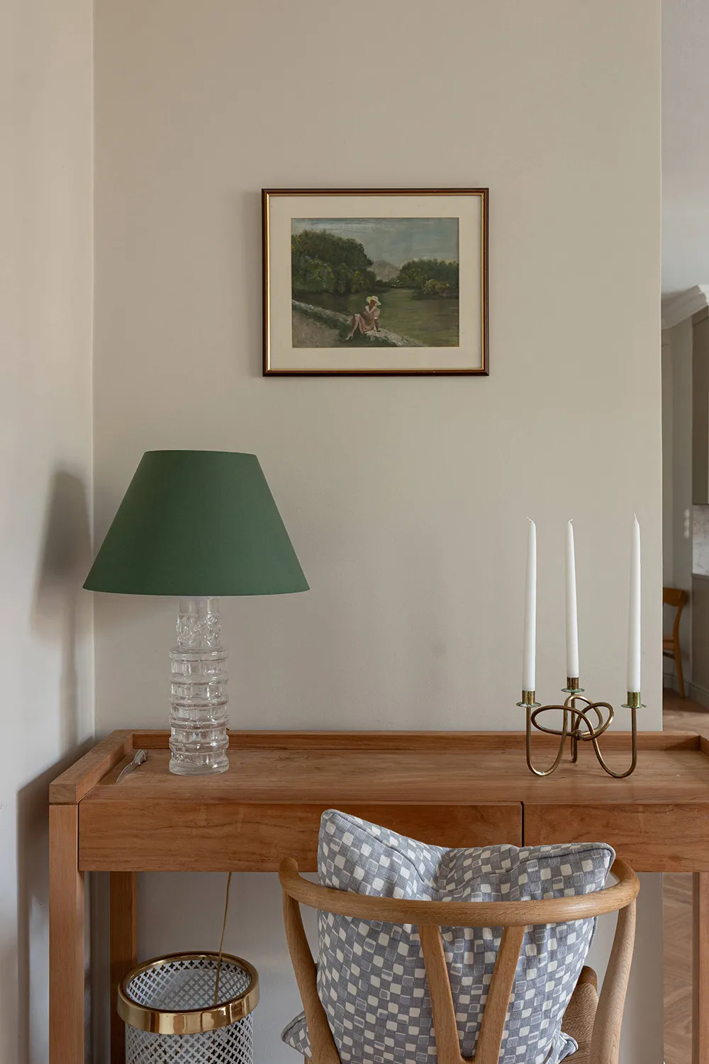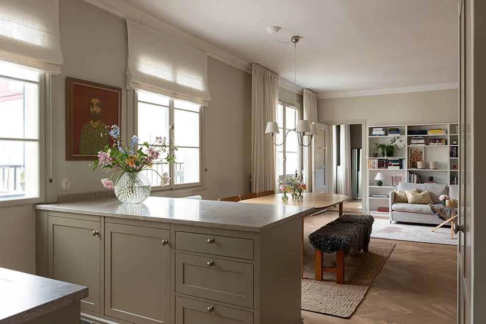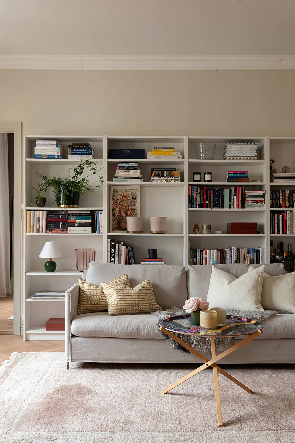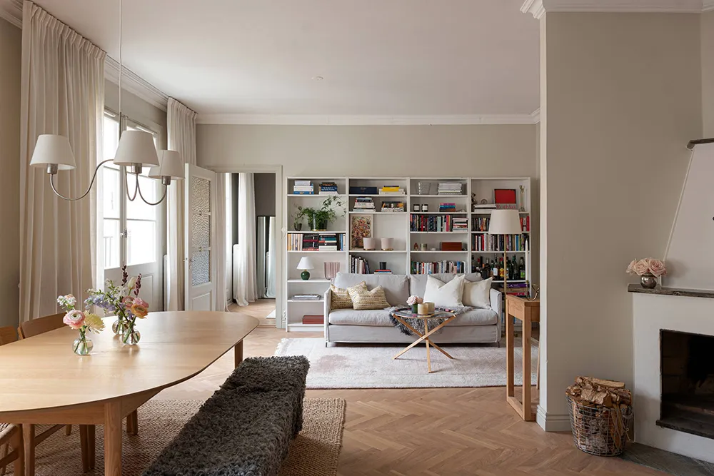 Intérieur beige confortable avec bibliothèque dans un appartement suédois à Stockholm (63 m²)