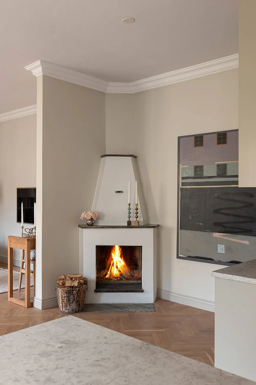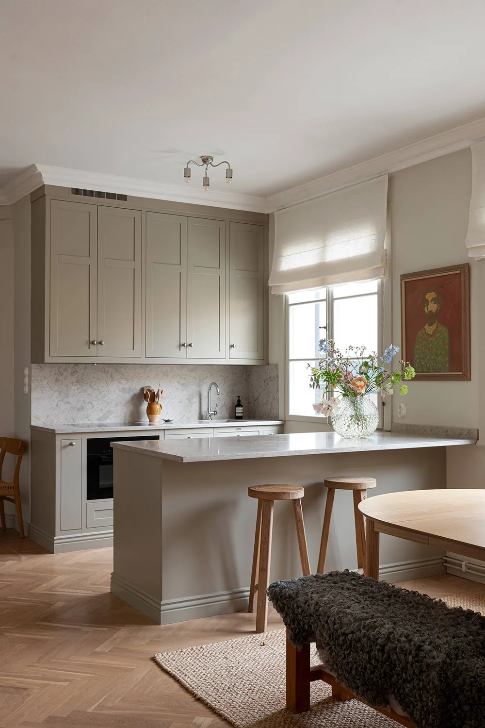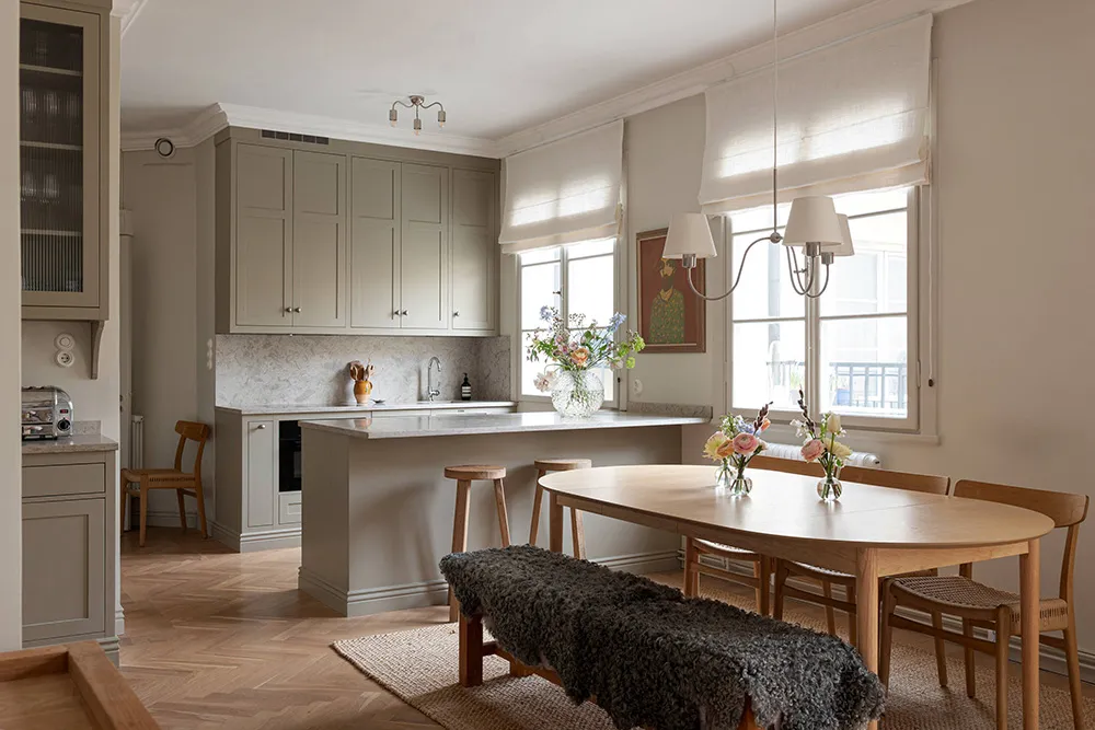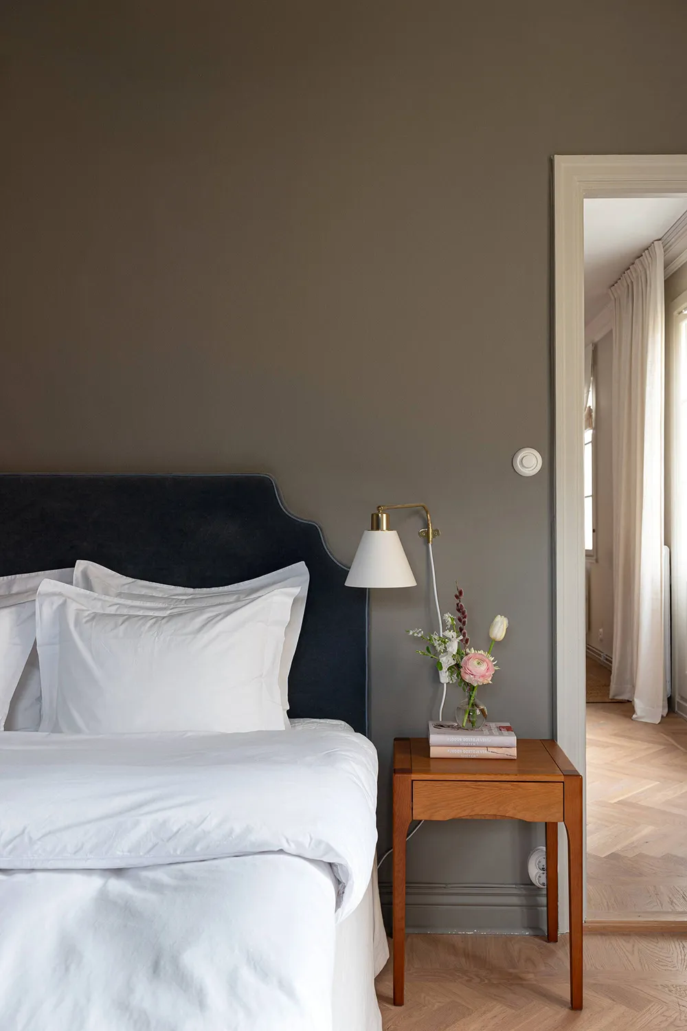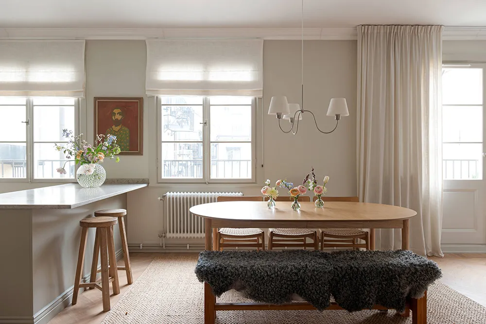 Une atmosphère calme dans cet appartement suédois est seulement dérangée par une bibliothèque dans la salle de séjour — les livres sur ses étagères ouvertes apportent de la couleur et de la vie à cet intérieur monochrome.