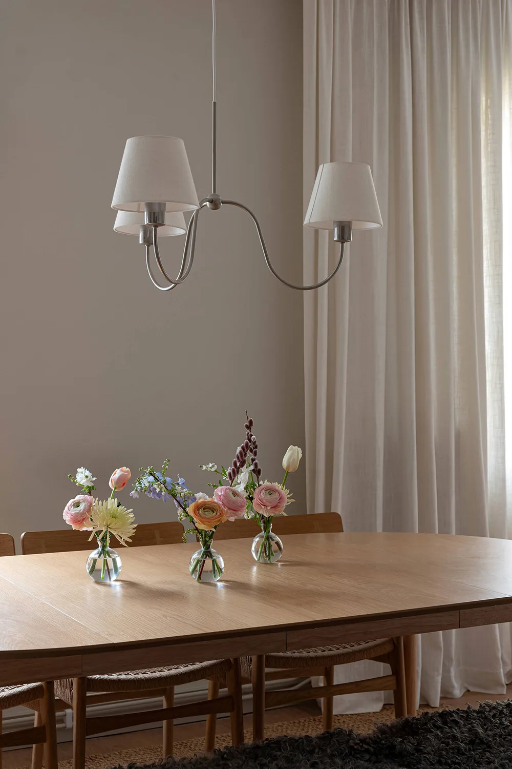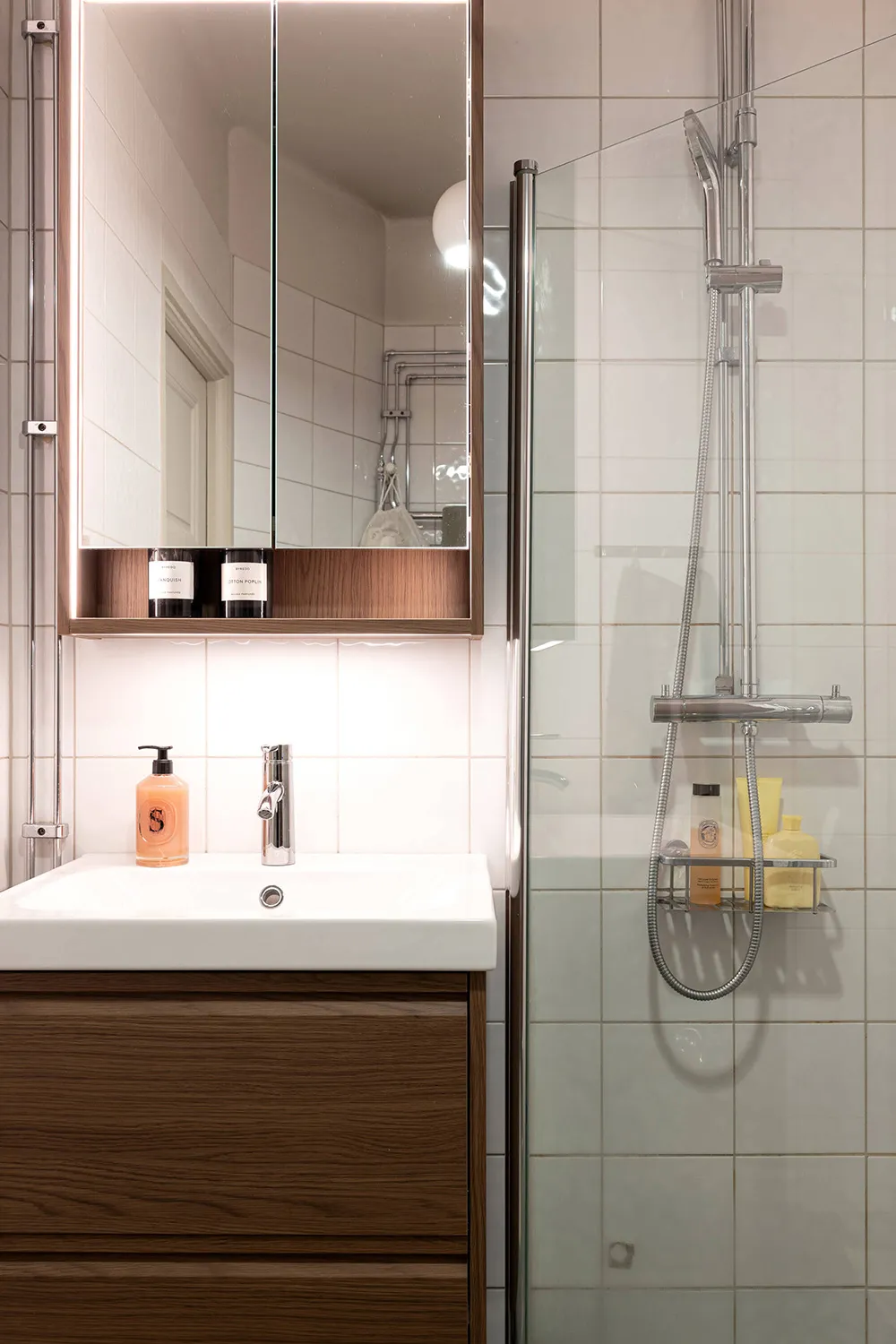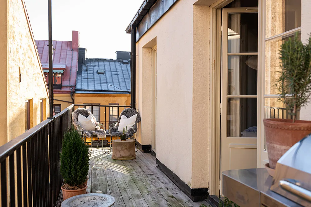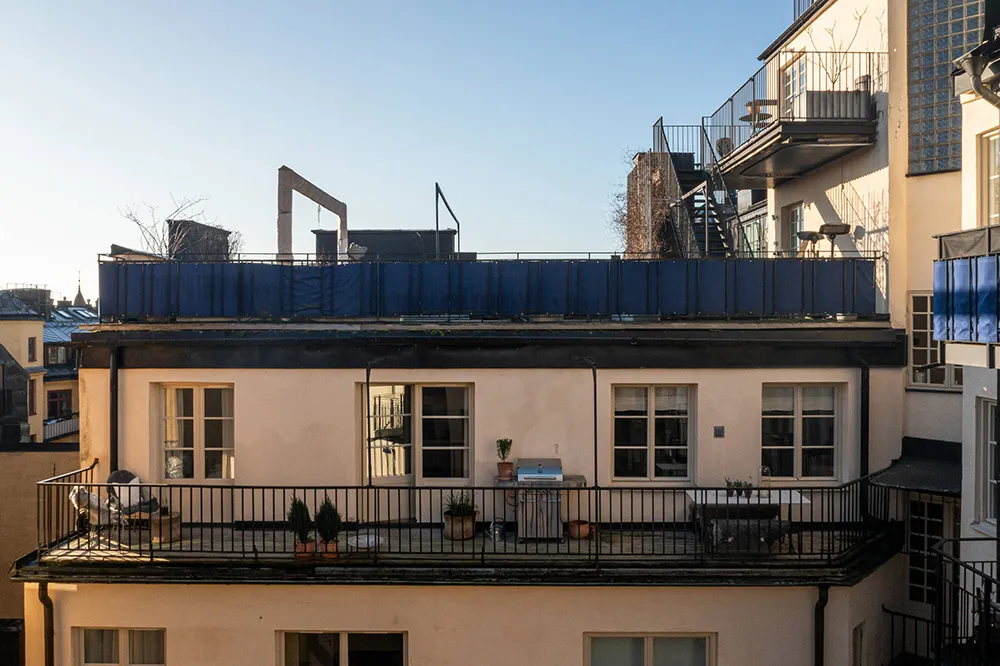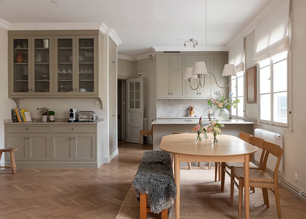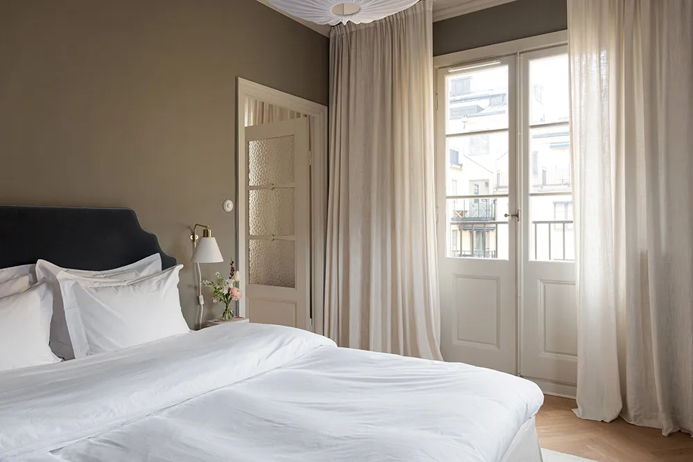 Une atmosphère calme dans cet appartement suédois est seulement dérangée par une bibliothèque dans la salle de séjour — les livres sur ses étagères ouvertes apportent de la couleur et de la vie à cet intérieur monochrome.
