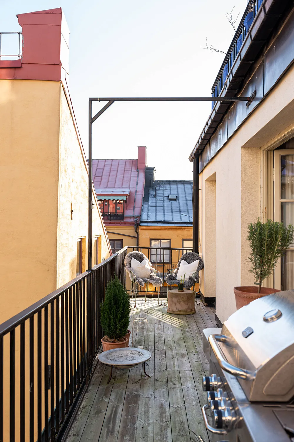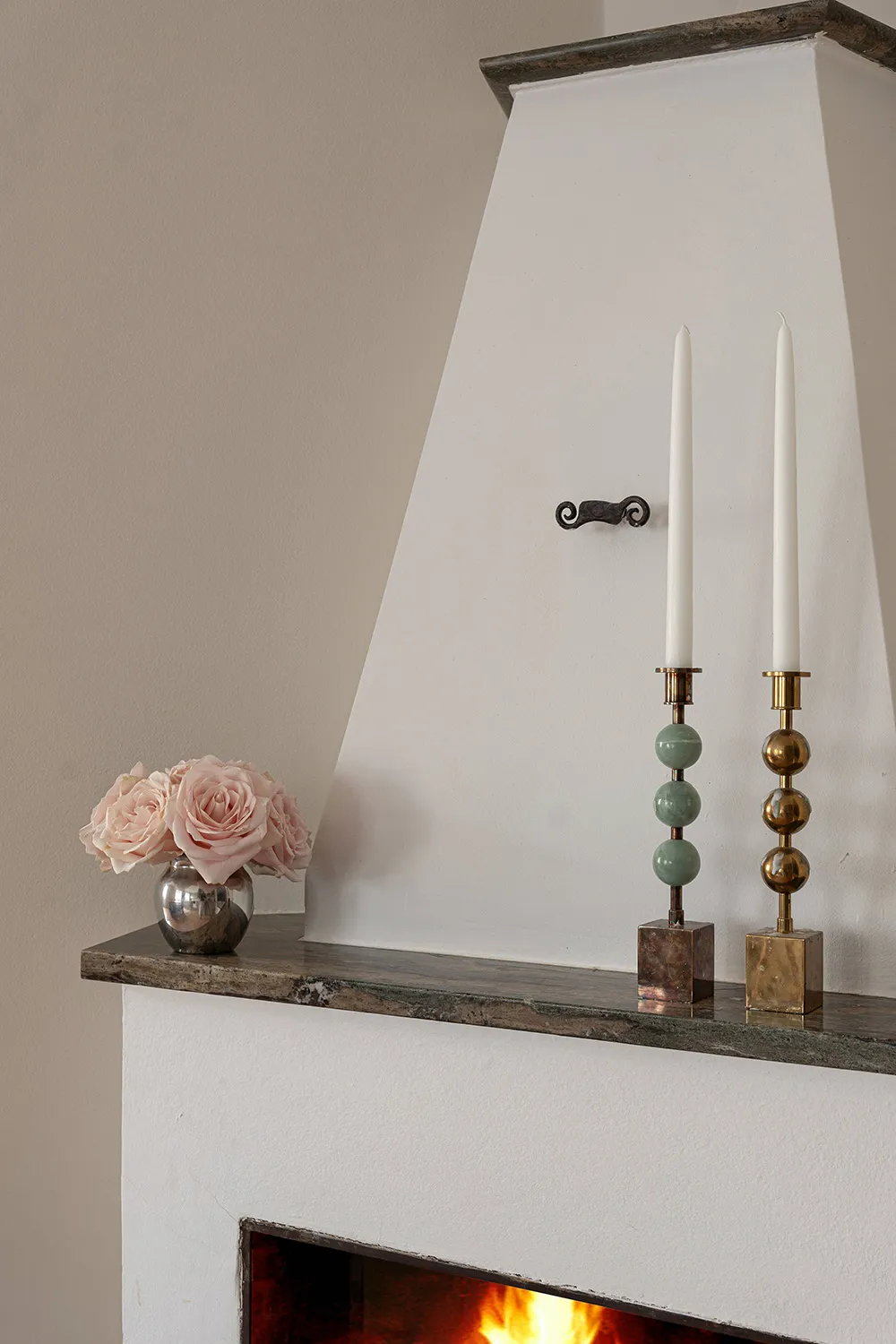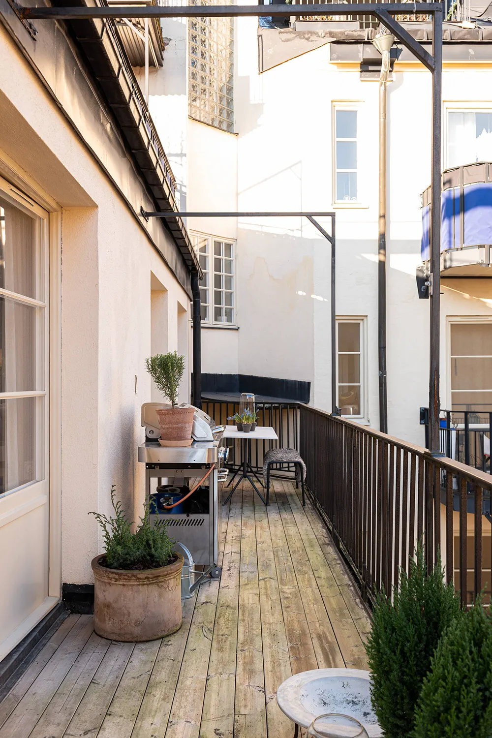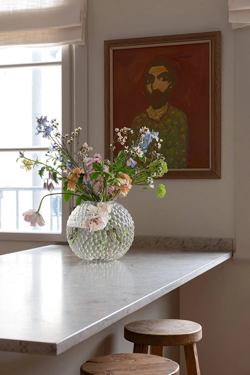 Une atmosphère calme dans cet appartement suédois est seulement dérangée par une bibliothèque dans la salle de séjour — les livres sur ses étagères ouvertes apportent de la couleur et de la vie à cet intérieur monochrome.