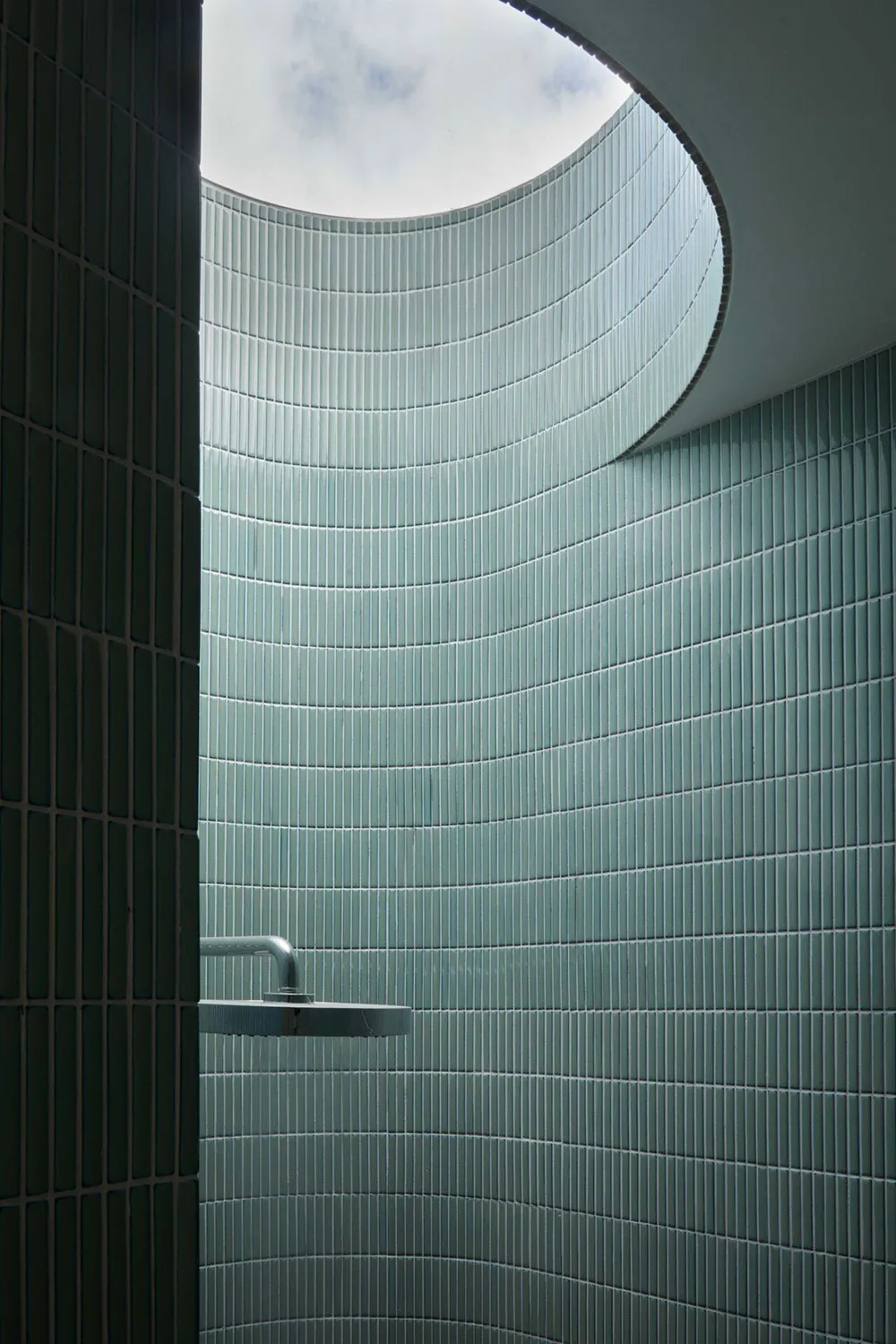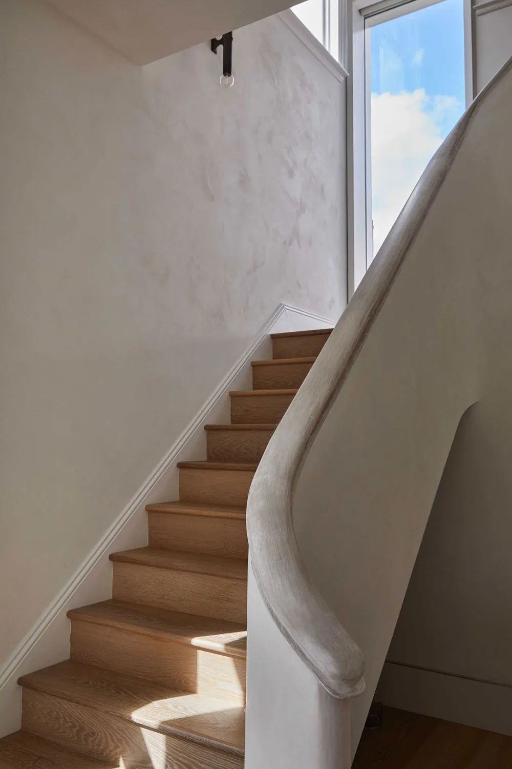 सूर्य की रोशनी एवं सुंदर डेनिश विला; जिसमें गुलाबी रंग की सीढ़ियाँ हैं।
