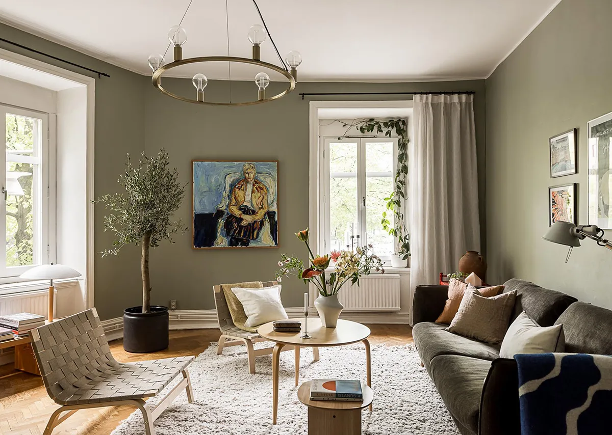 स्वीडिश अपार्टमेंट (76 वर्ग मीटर) के डिज़ाइन में जैतूनी एवं अन्य हरे रंगों का उपयोग किया गया है.