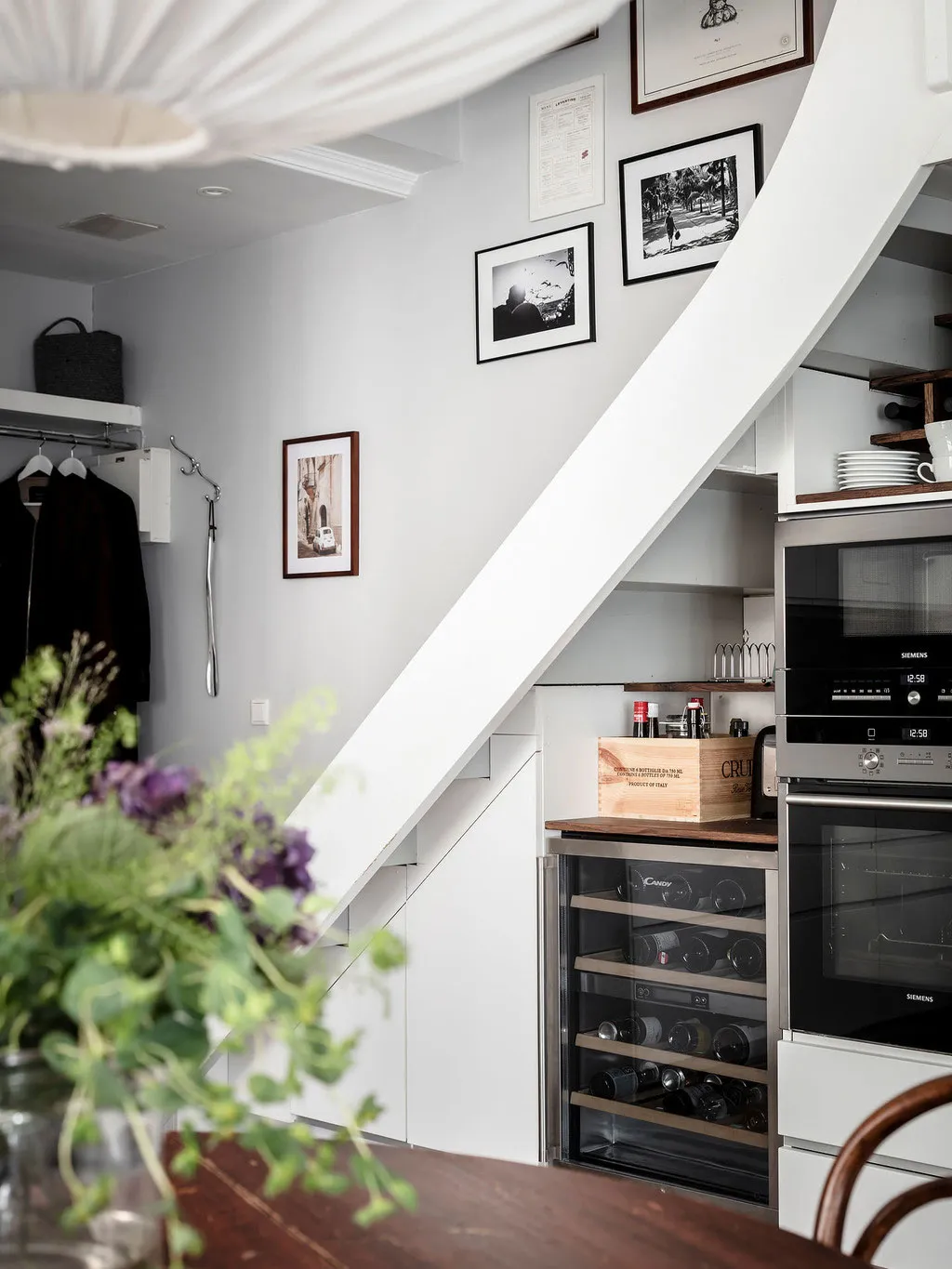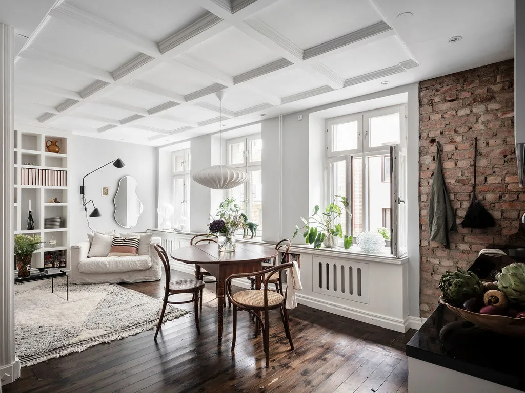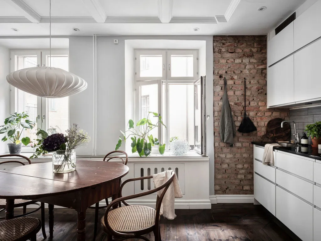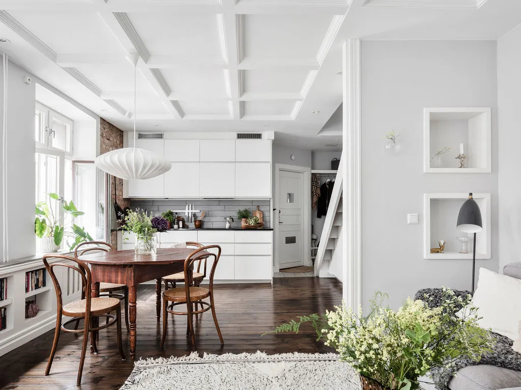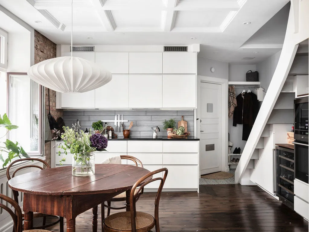 रसोई क्षेत्र में सफ़ेद रंग की आंतरिक सजावट, लकड़ी से बना छत एवं ईंटों से बनी दीवारें (62 वर्ग मीटर का क्षेत्र)