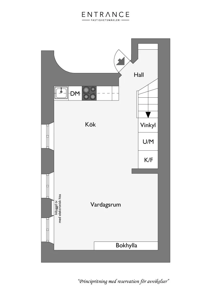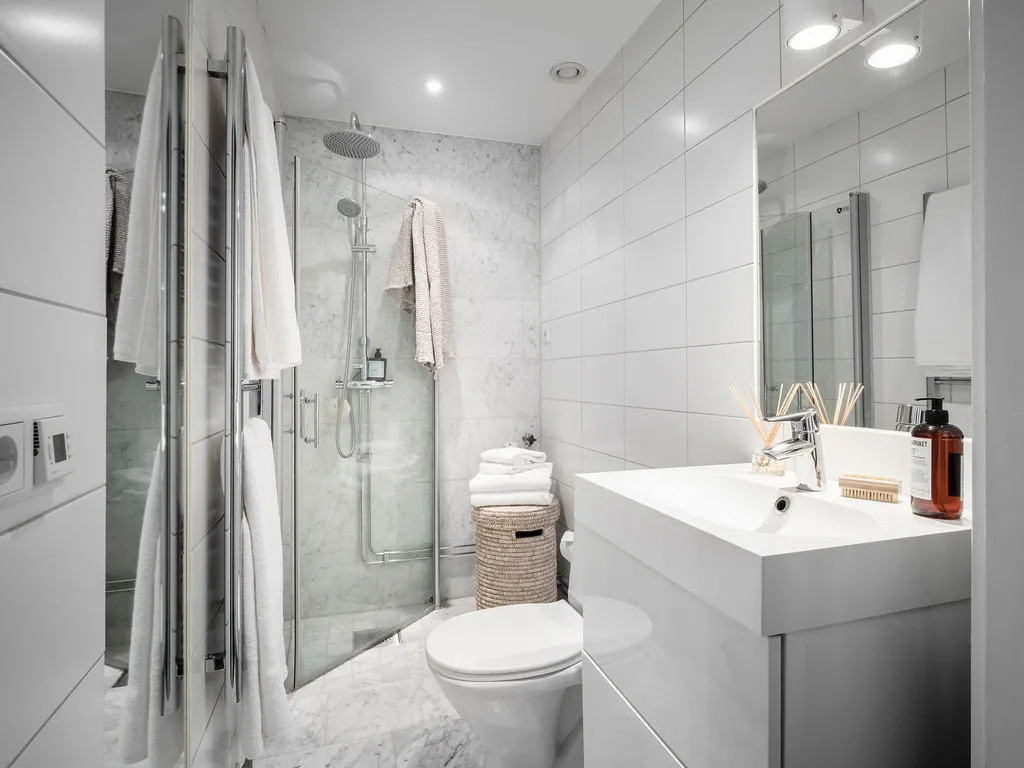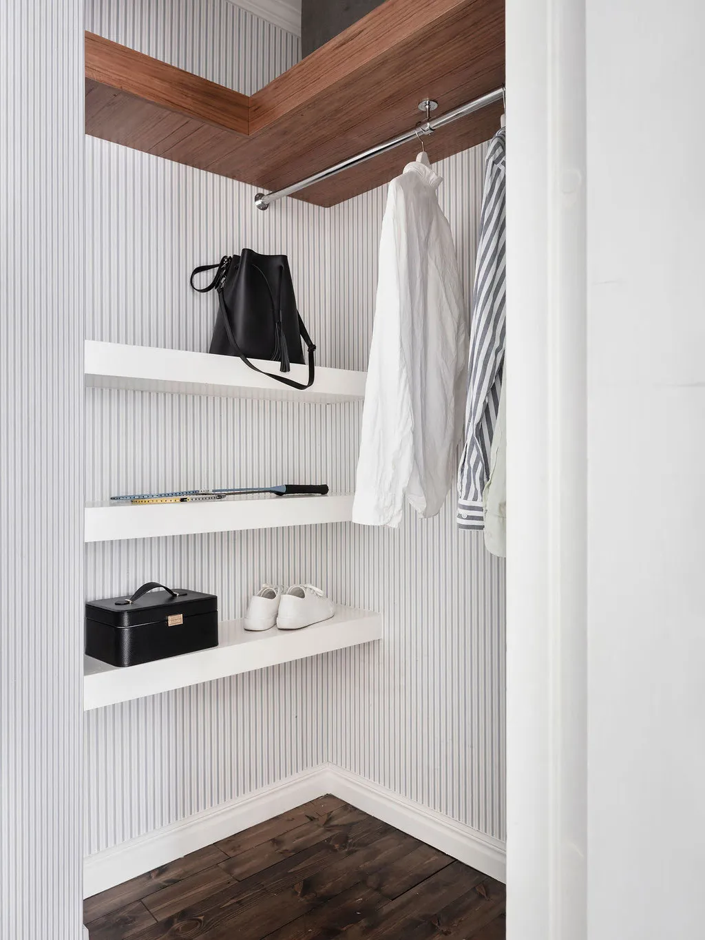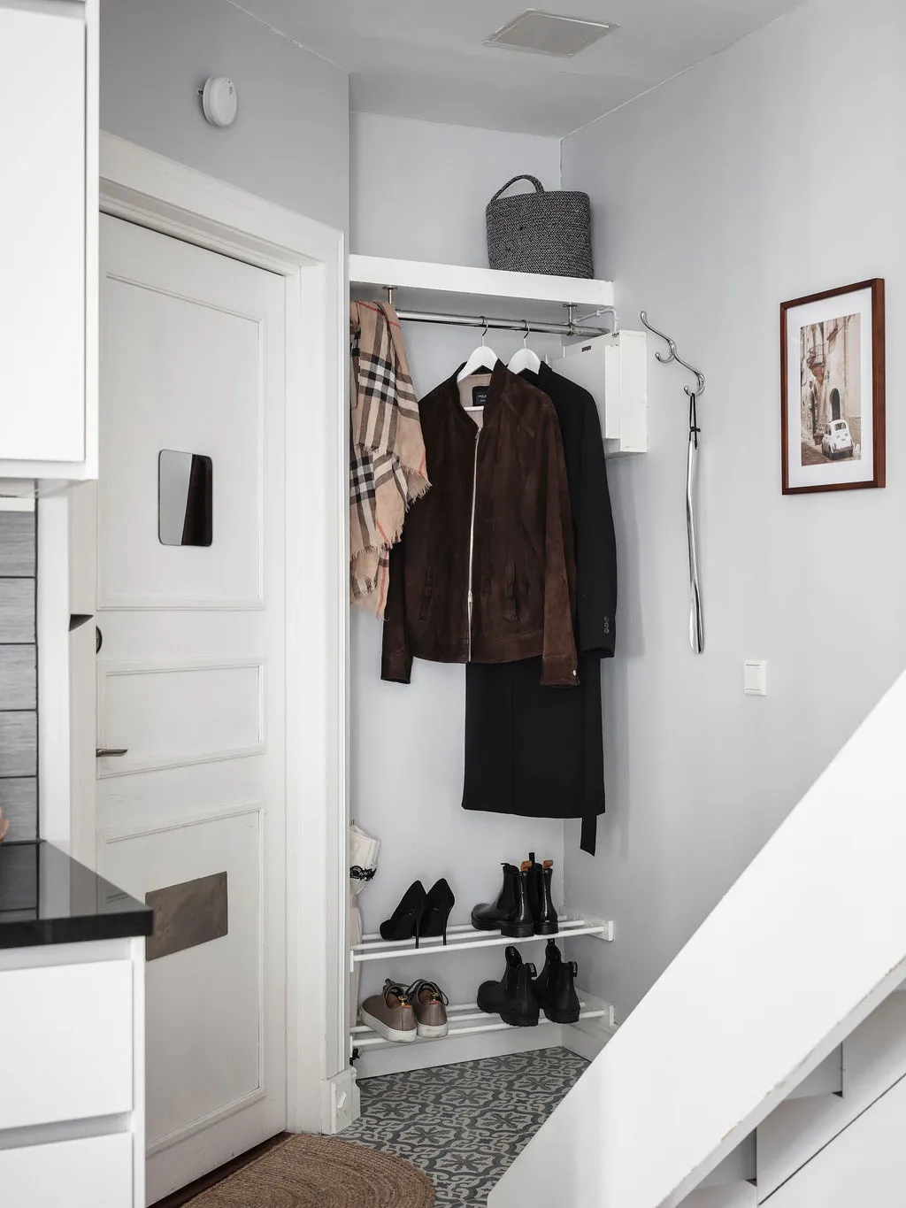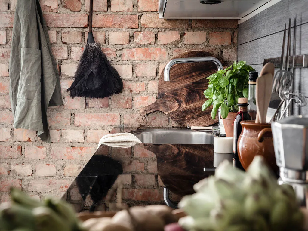 रसोई क्षेत्र में सफ़ेद रंग की आंतरिक सजावट, लकड़ी से बना छत एवं ईंटों से बनी दीवारें (62 वर्ग मीटर का क्षेत्र)
