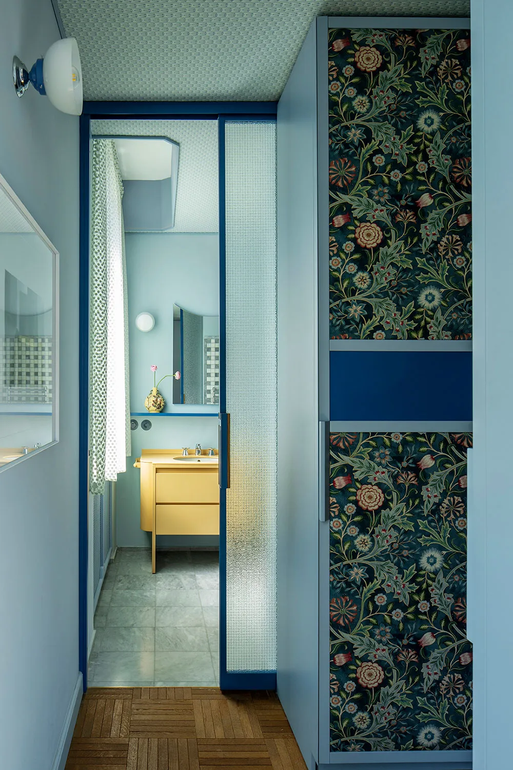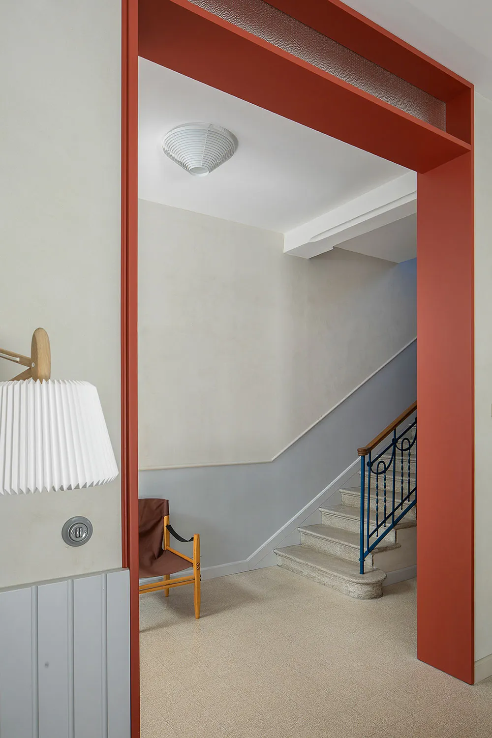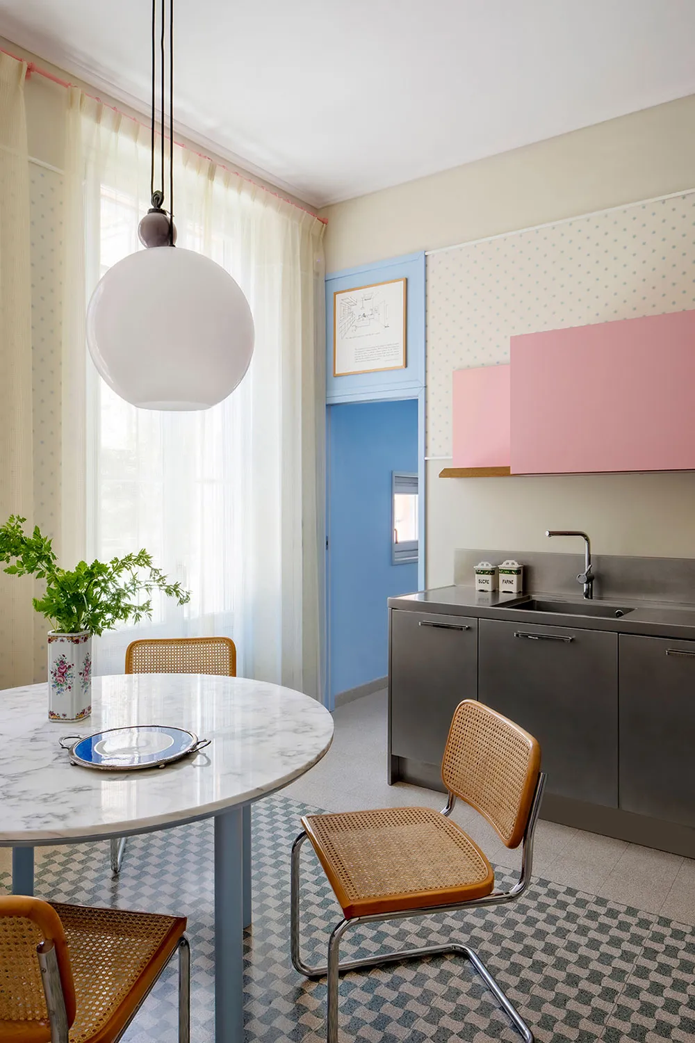 赤と青のポータル、青い座面のレトロな椅子、花柄の壁紙、そしてパステル調のアクセント――ペシエーラの中心部にあるこの100年歴史の美しい家の内装は、最近鮮やかな新たな姿に生まれ変わりました。