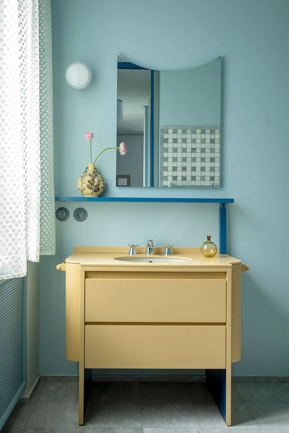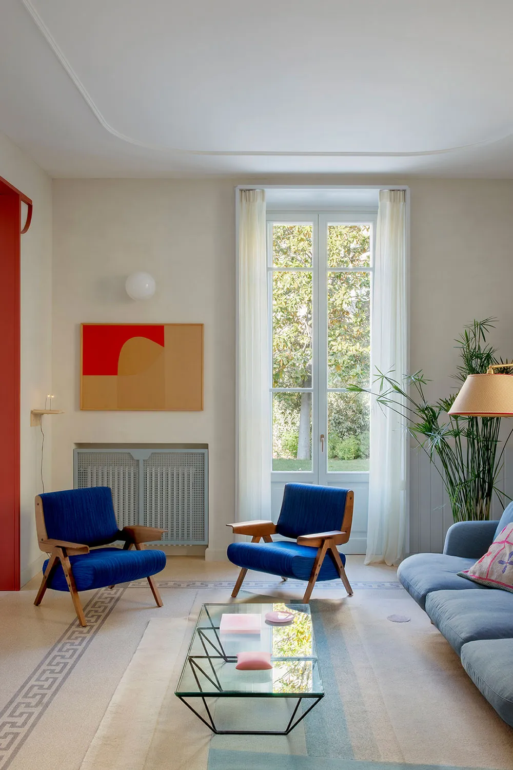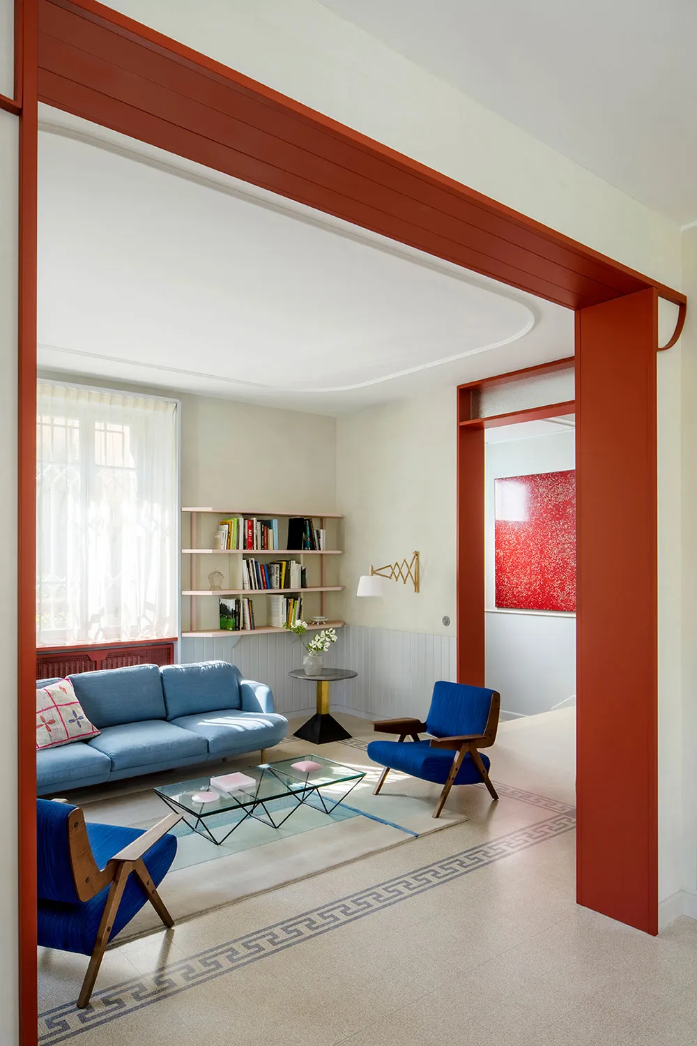 赤と青のポータル、青い座面のレトロな椅子、花柄の壁紙、そしてパステル調のアクセント――ペシエーラの中心部にあるこの100年歴史の美しい家の内装は、最近鮮やかな新たな姿に生まれ変わりました。