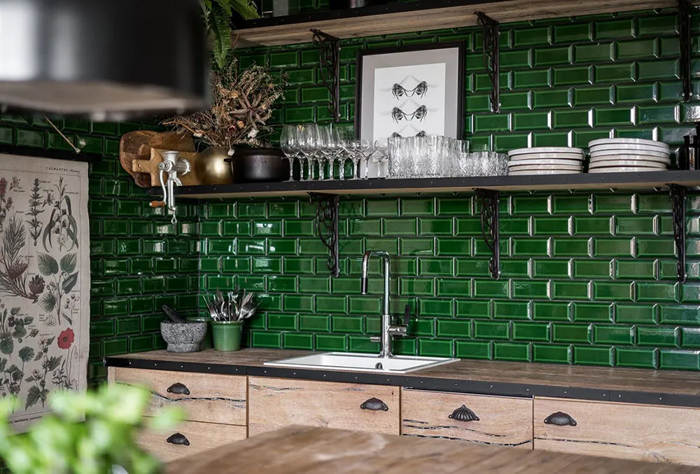 コペンハーゲンにある、スタイリッシュなグリーンの壁と装飾が施されたデザイナーファミリーアパートメント