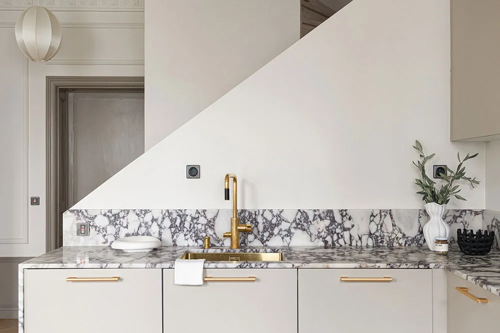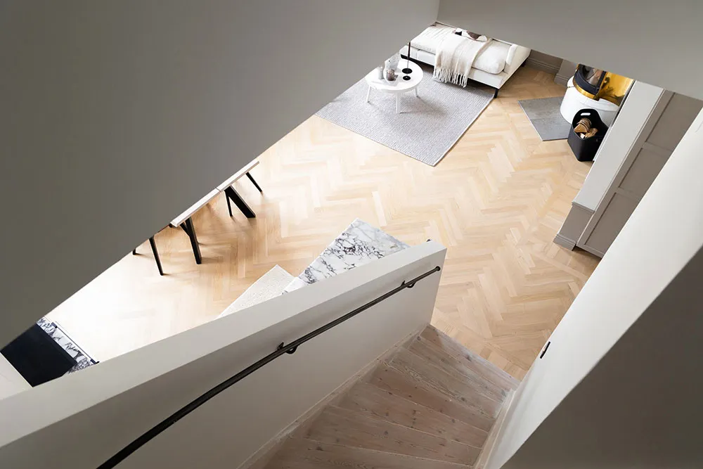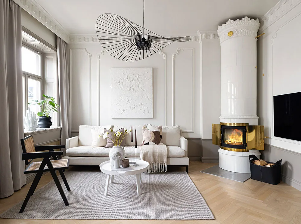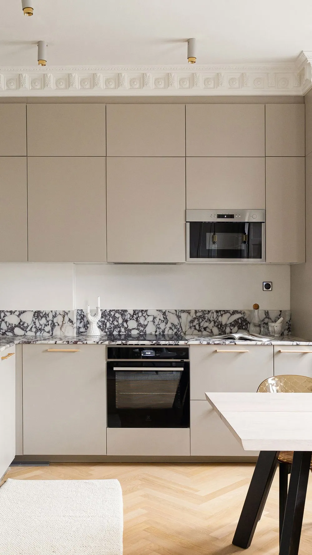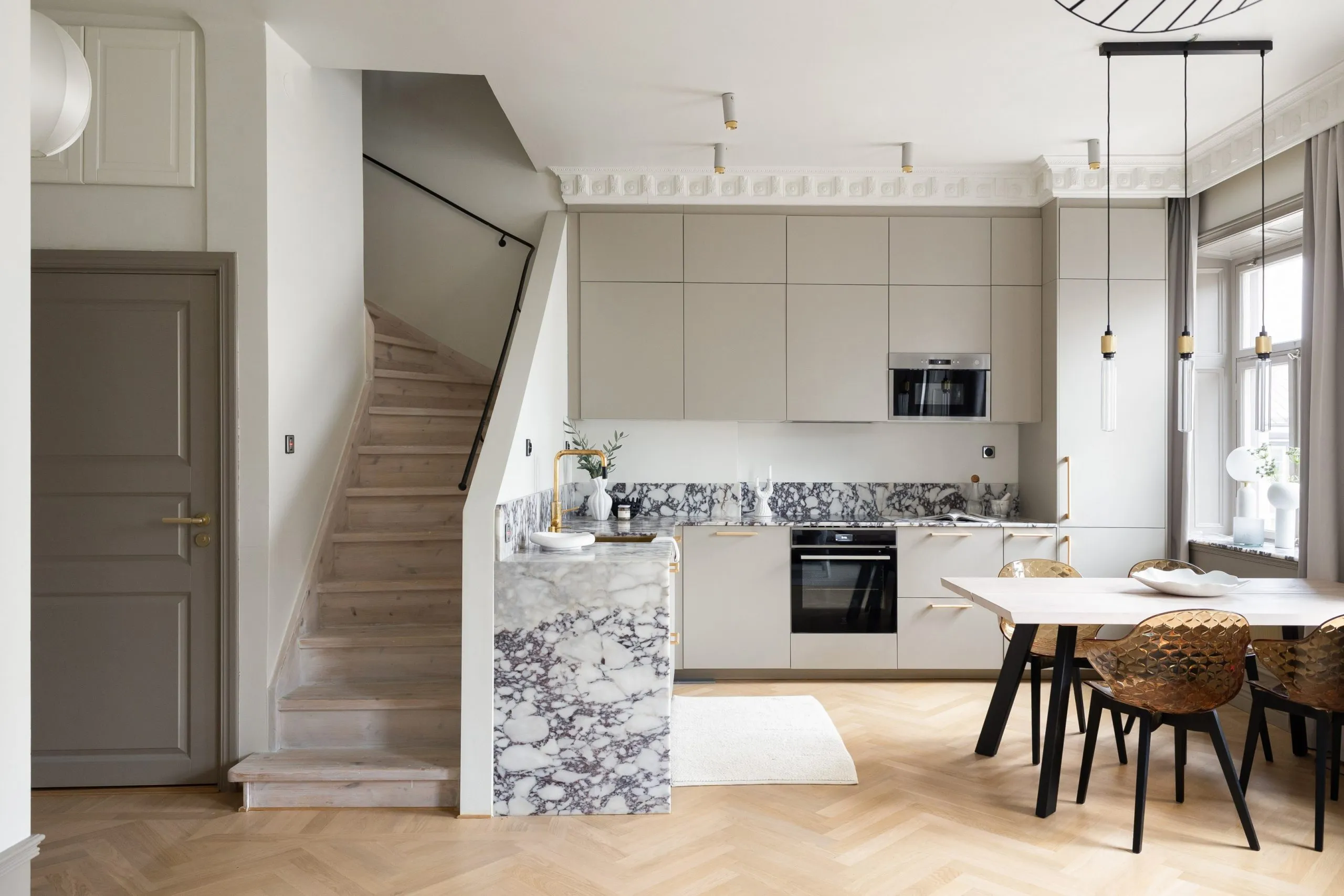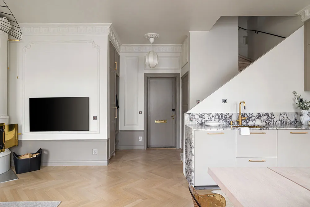 モールディングと大理石:ストックホルムの屋根裏にある2階建てアパートのエレガントなインテリア