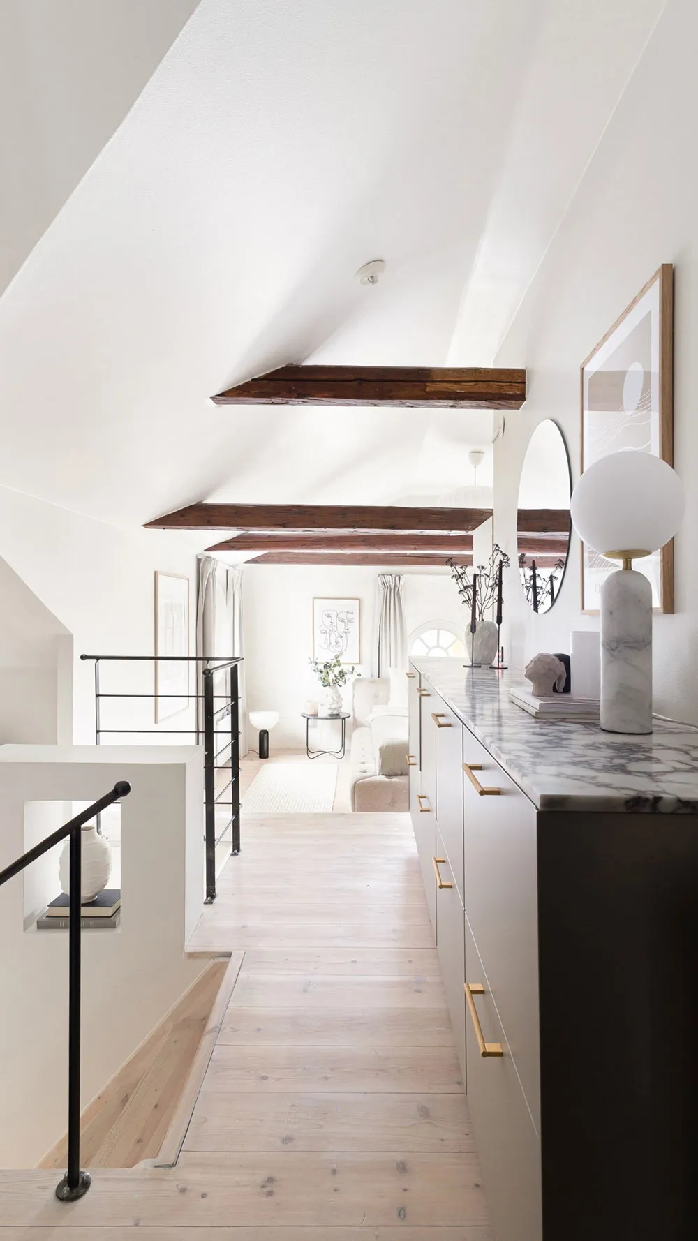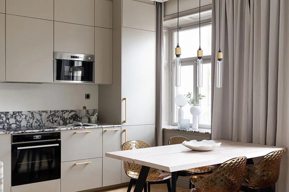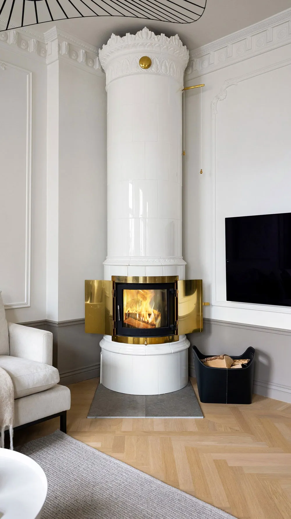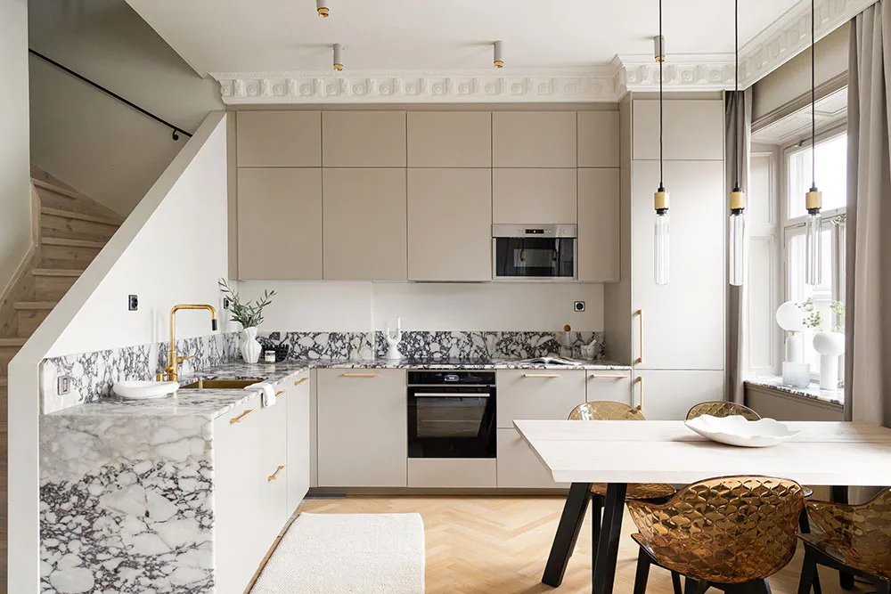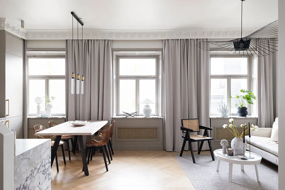 モールディングと大理石:ストックホルムの屋根裏にある2階建てアパートのエレガントなインテリア