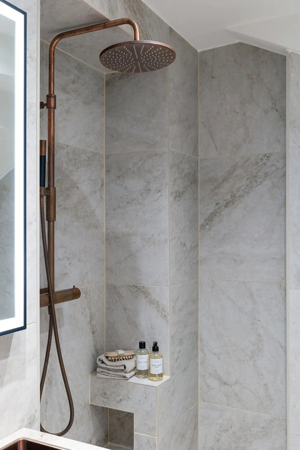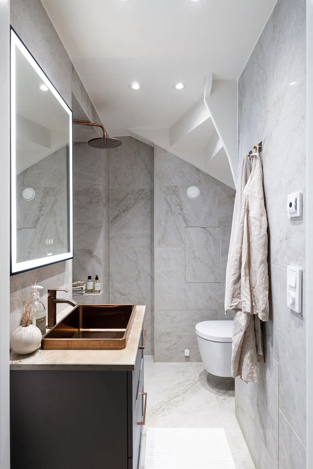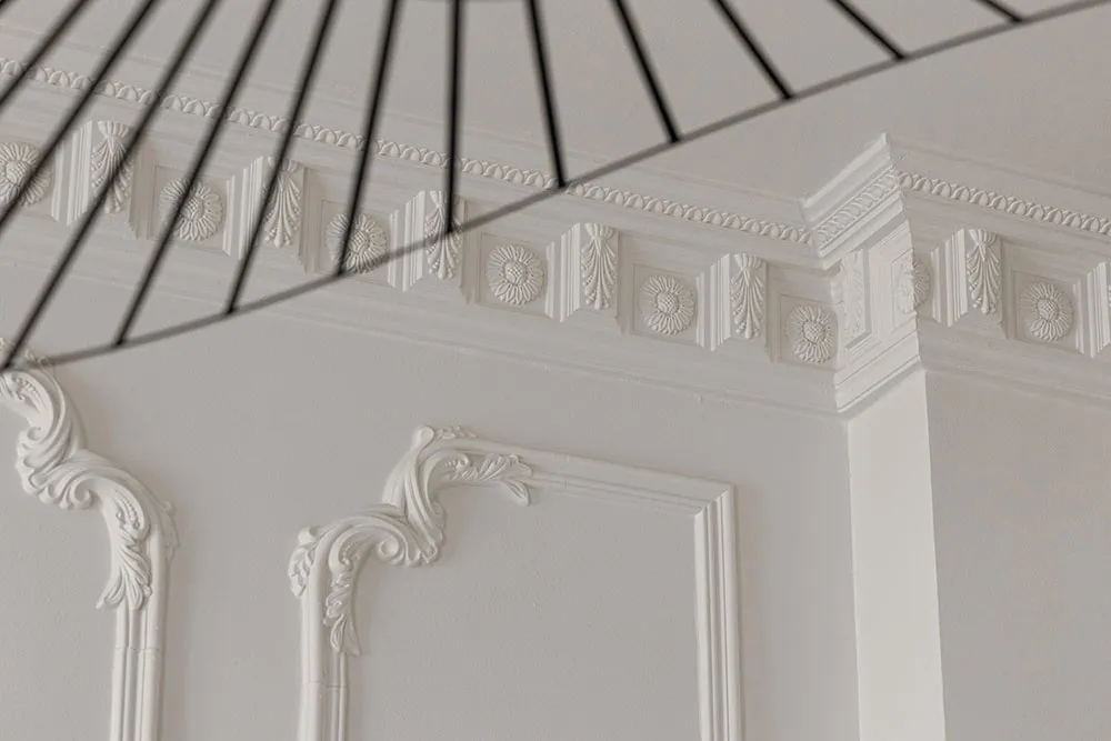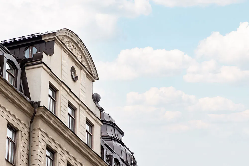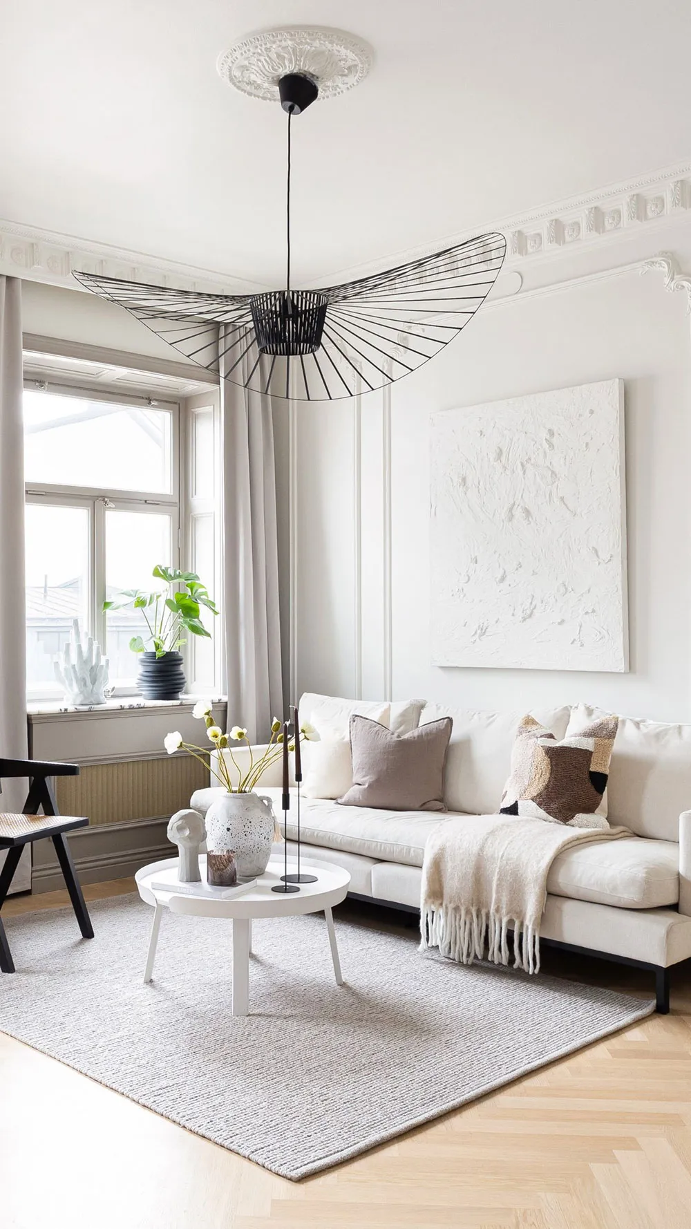 モールディングと大理石:ストックホルムの屋根裏にある2階建てアパートのエレガントなインテリア