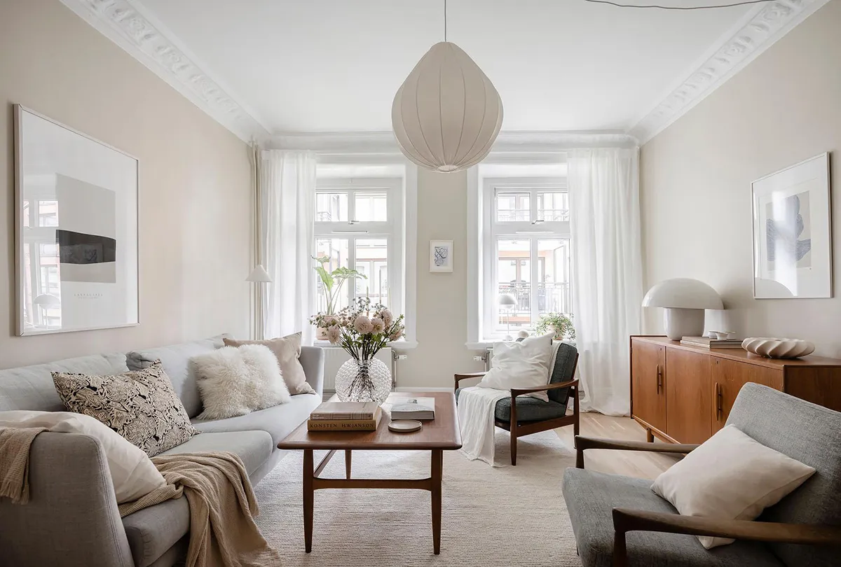 ソフトなスカンジナビア風のインテリアとクールな寝室(60平方メートル)