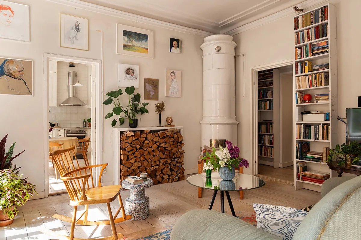 木製ストーブとヴィンテージ家具:スウェーデンの快適なアパート(78平方メートル)