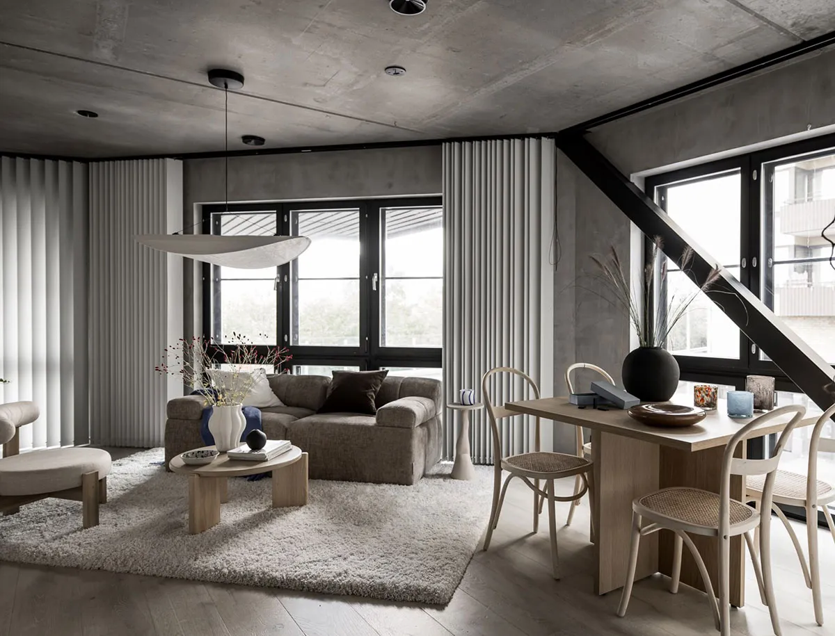 コンクリートの壁を持つスモールなスカンジナビア風アパートメント(46平方メートル)
