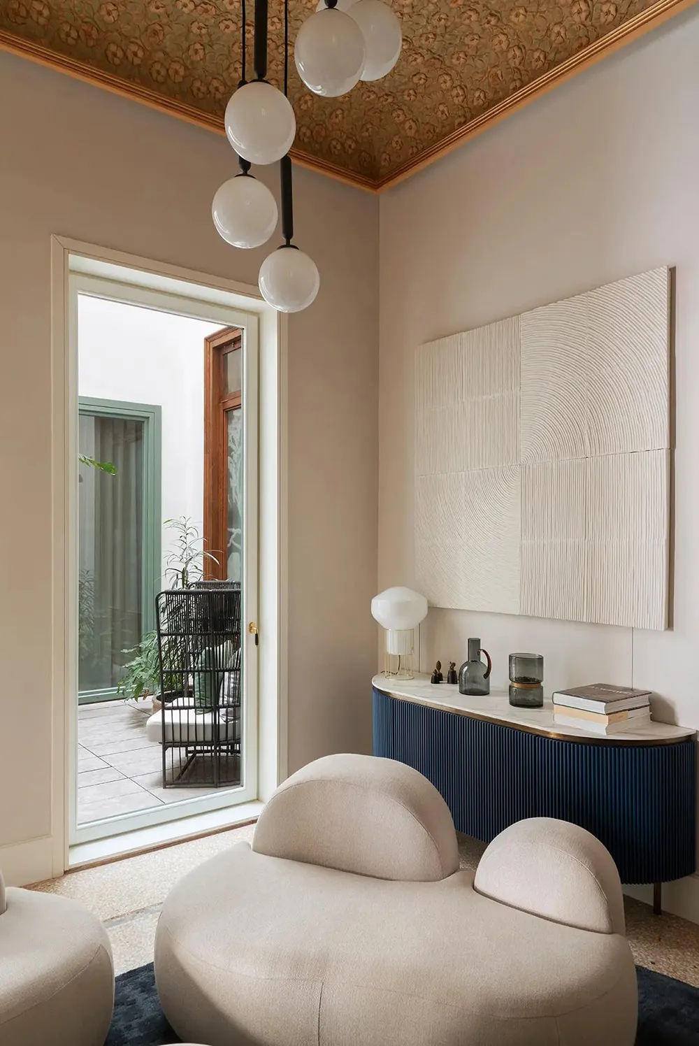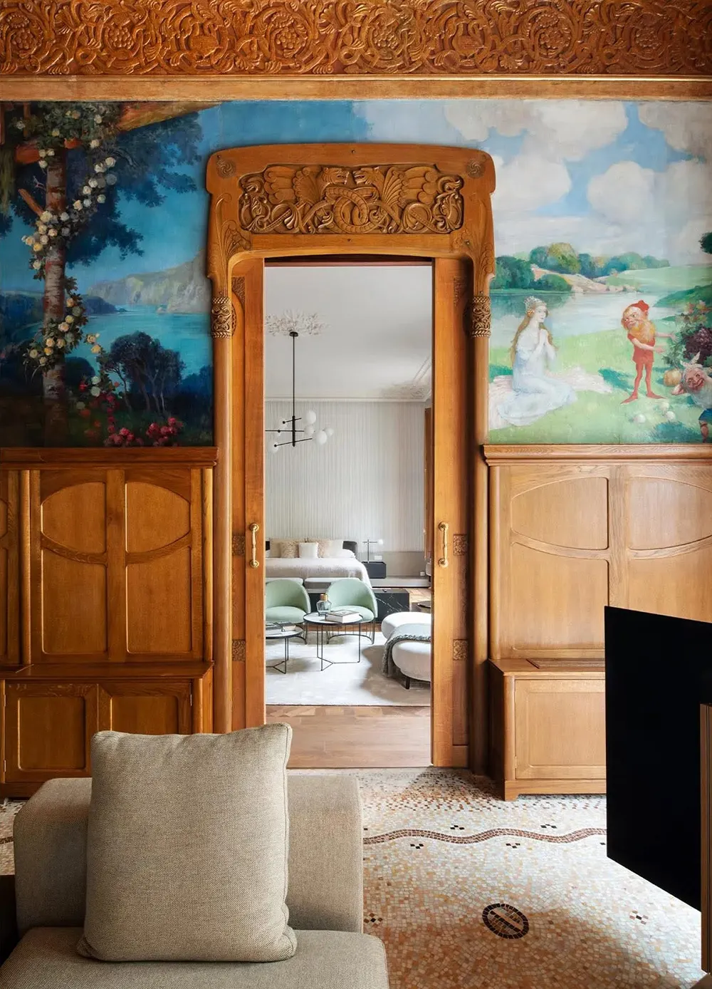 青い壁とヴィンテージなドア:スカンジナビア風の魅力的なアパート