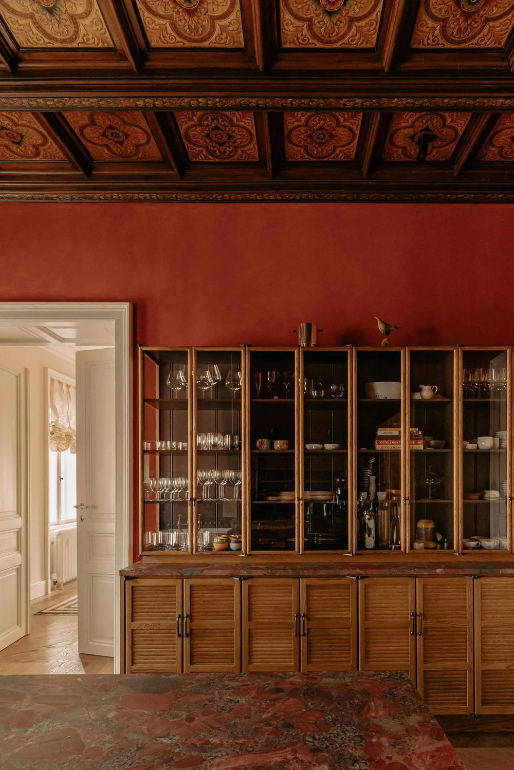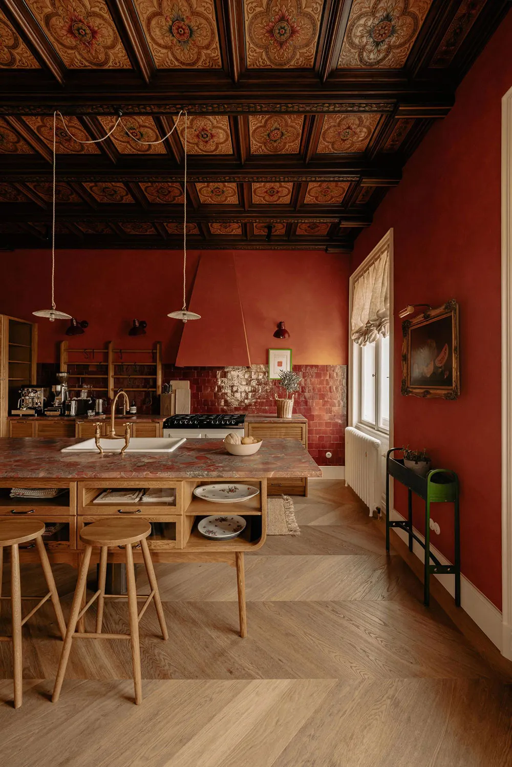 ウィーンにある、赤いキッチンとヴィンテージ調の家具が備え付けられた美しいアパートメント