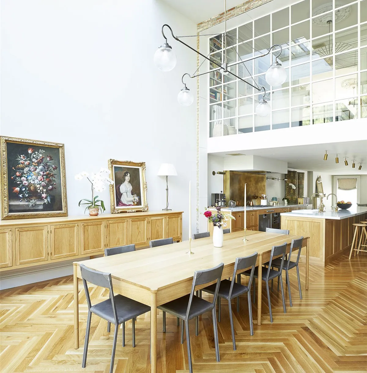 ブルックリンにあるタウンハウスデザインの中で、セカンドライトが効果的に使われ、豪華な仕上がりの工業用窓が採用されている例