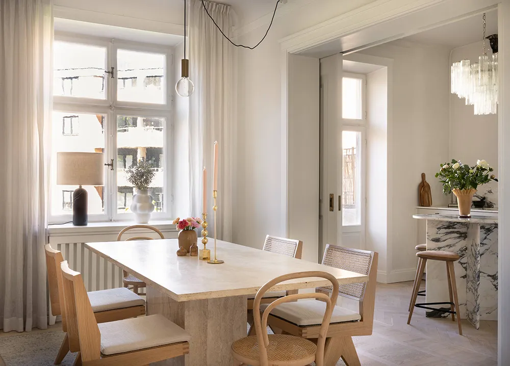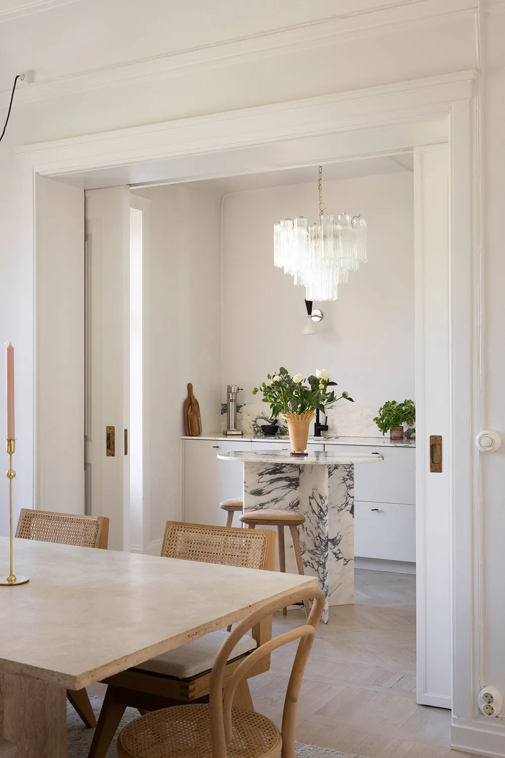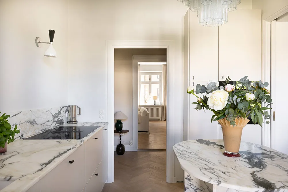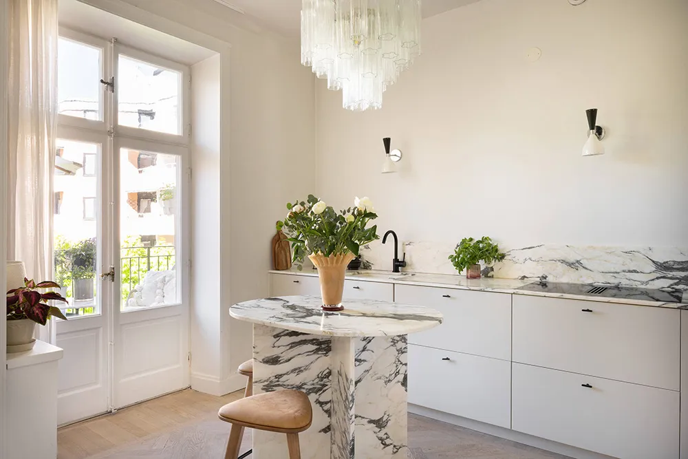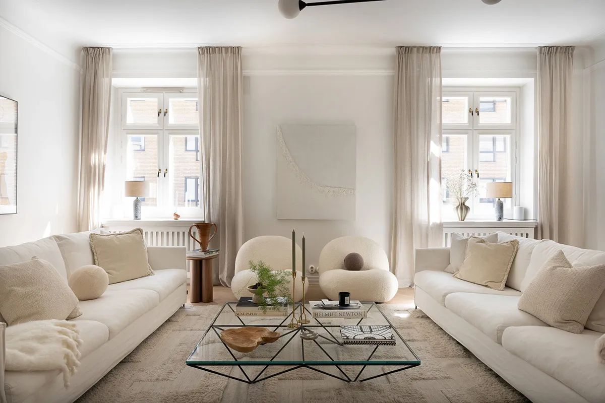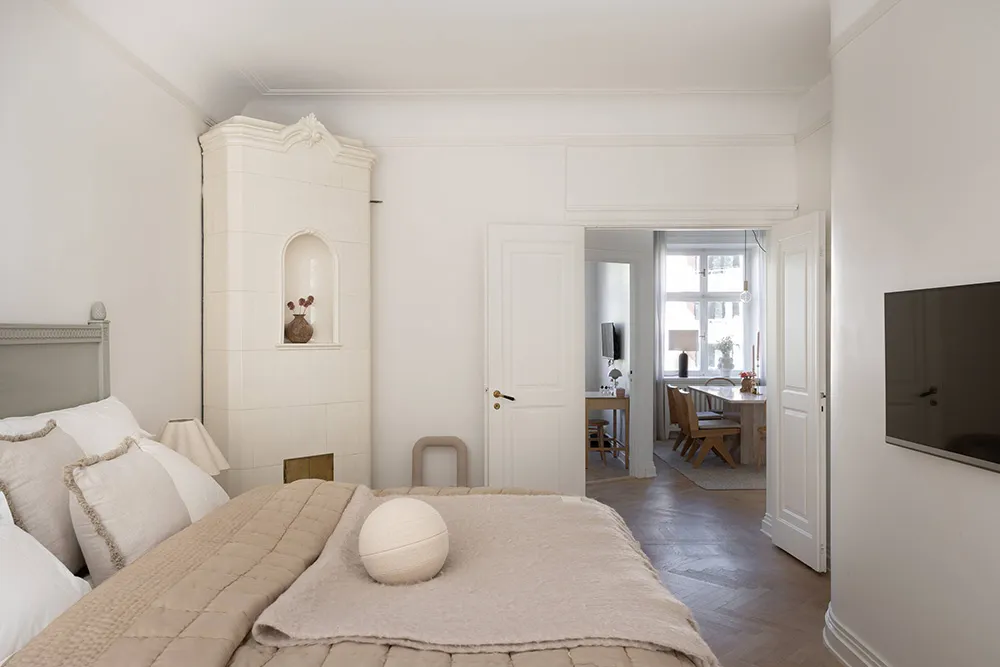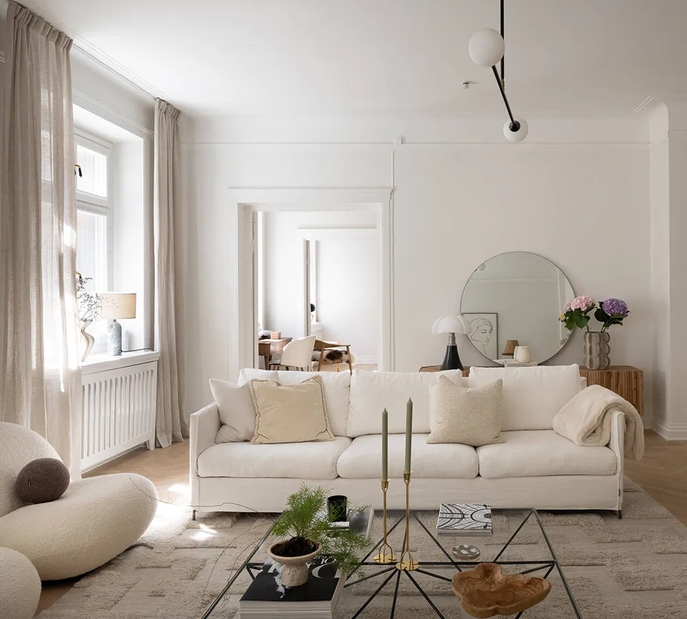 ストックホルムにある上品なアパートの、ソフトミルクのように白い内装