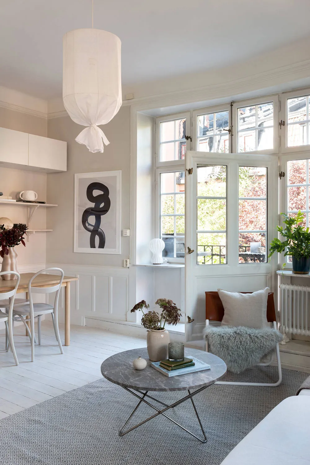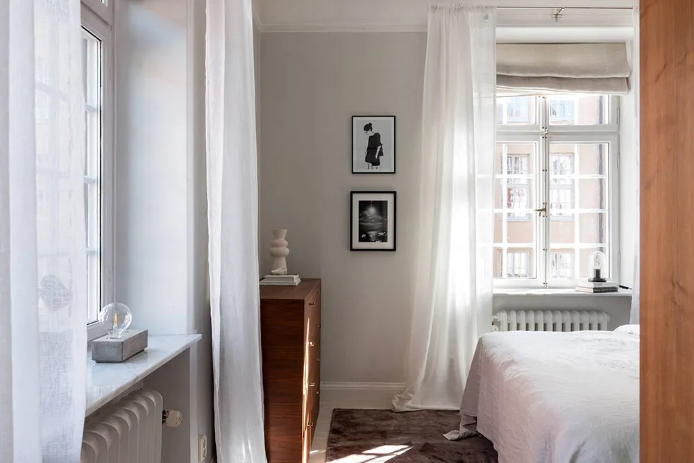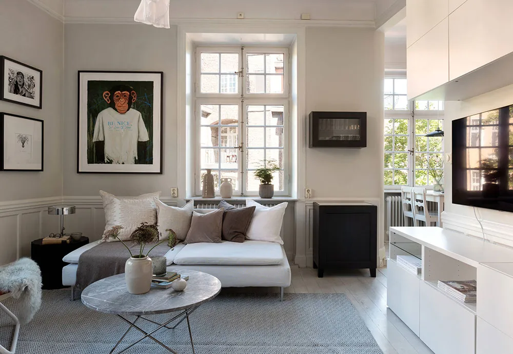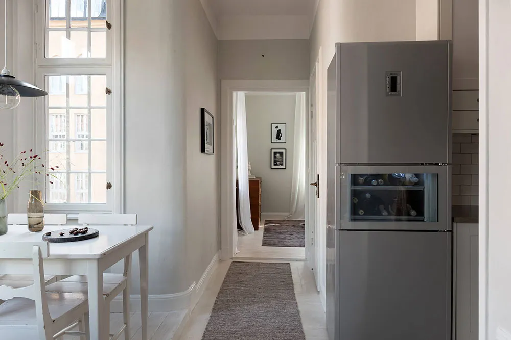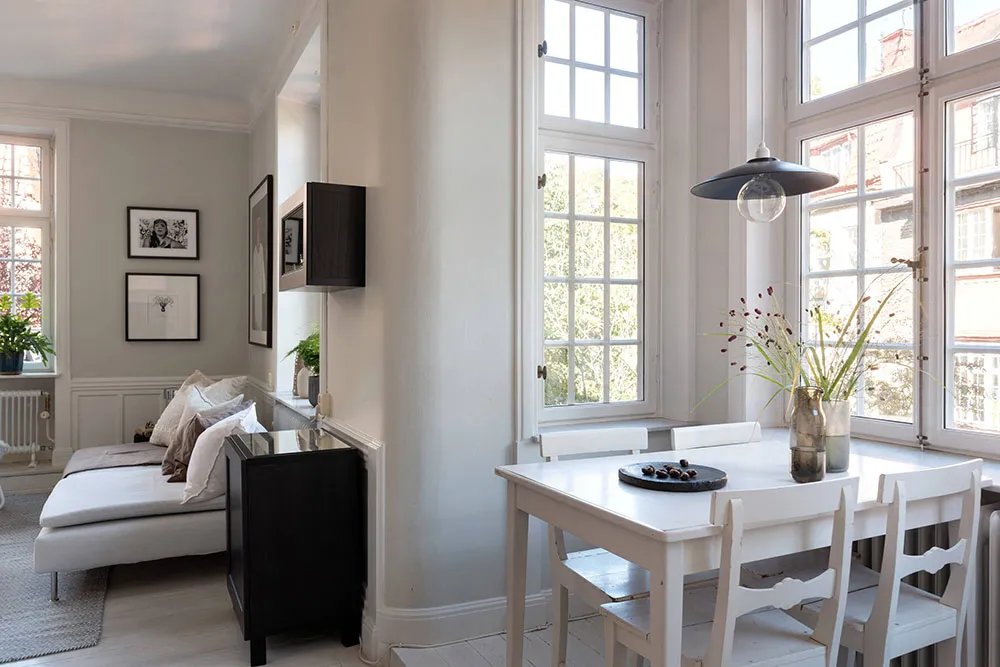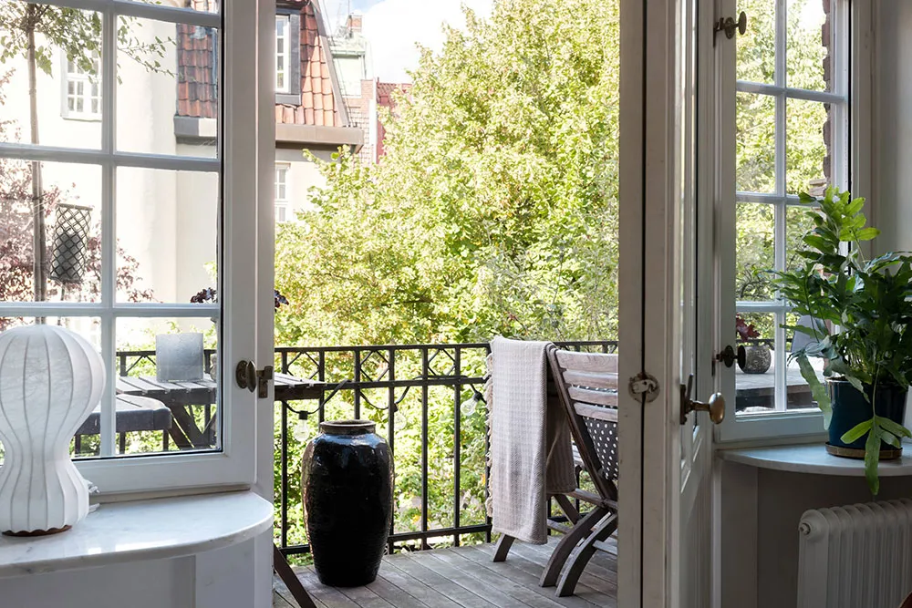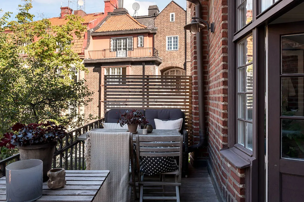 ストックホルムにあるこの2ベッドルームのアパートは、サイズとしてはかなりコンパクトですが、夏になると広いバルコニーがダイニングエリアやリラックススペースを備えた本格的なテラスに変わり、生活空間が大きく広がります。