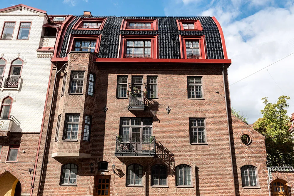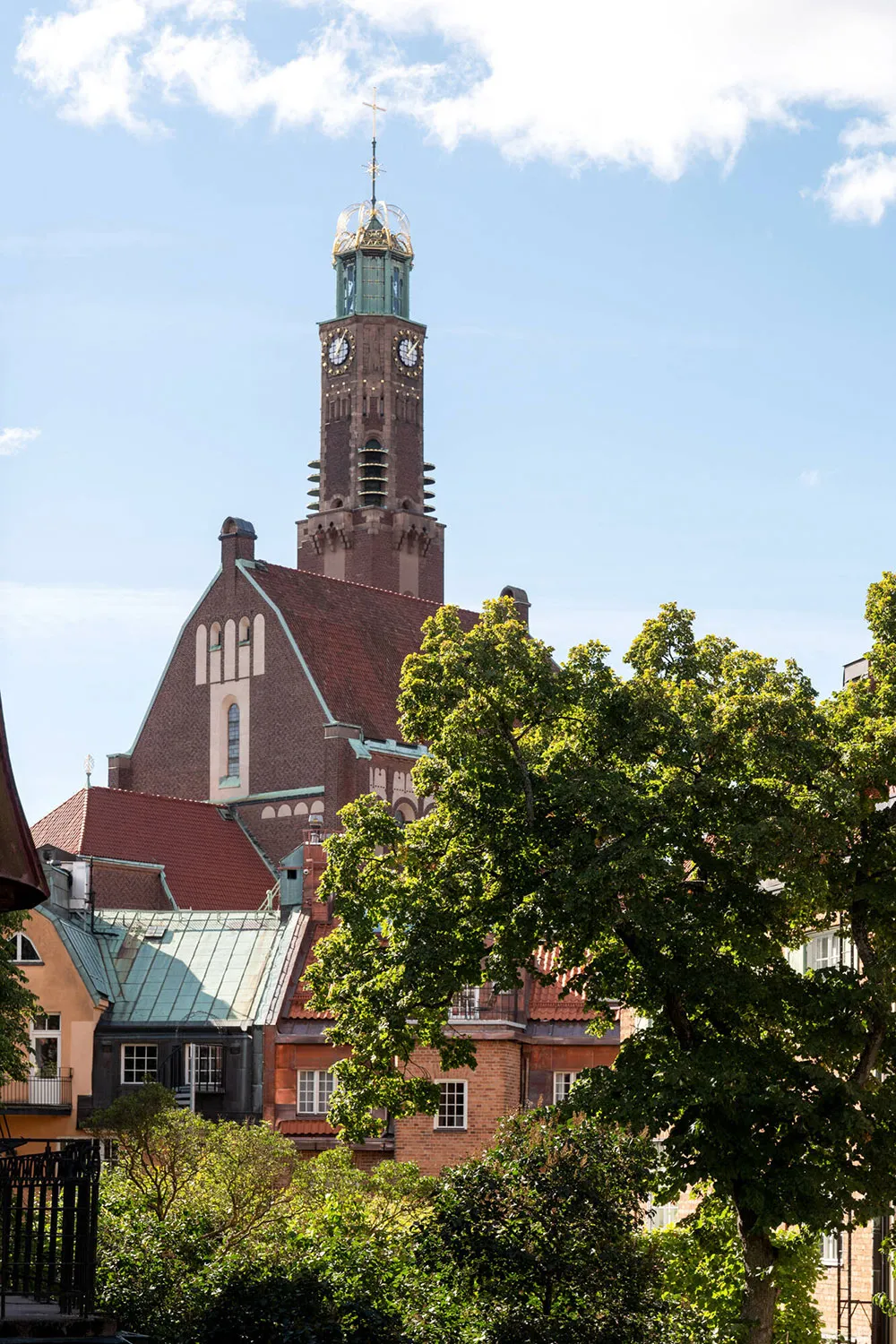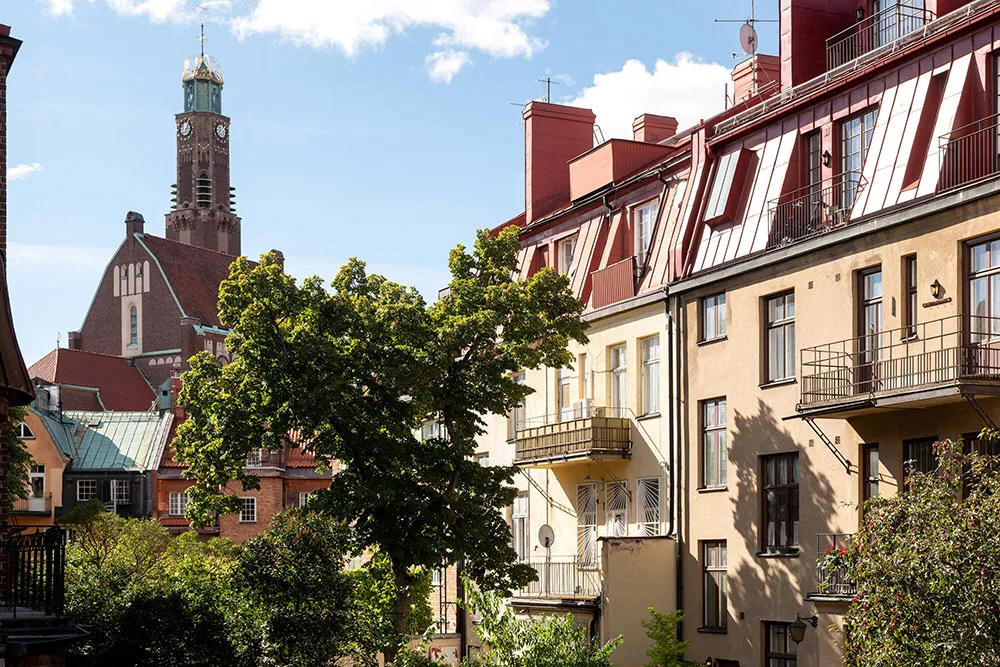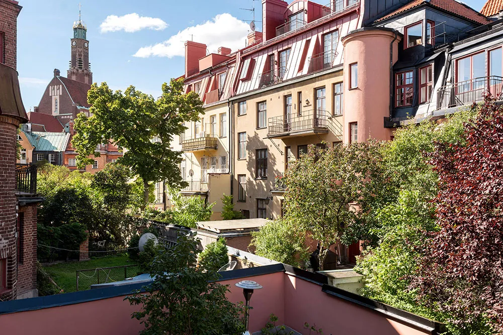 ストックホルムにある広いバルコニーと教会の眺めが楽しめる小さなアパート(48平方メートル)