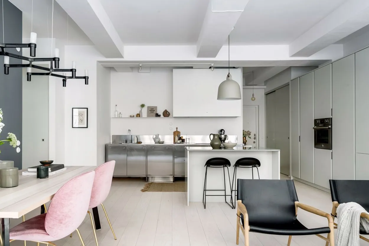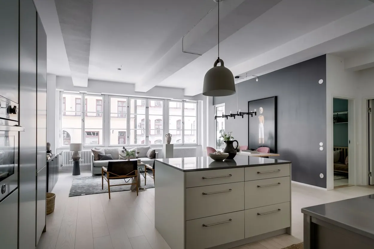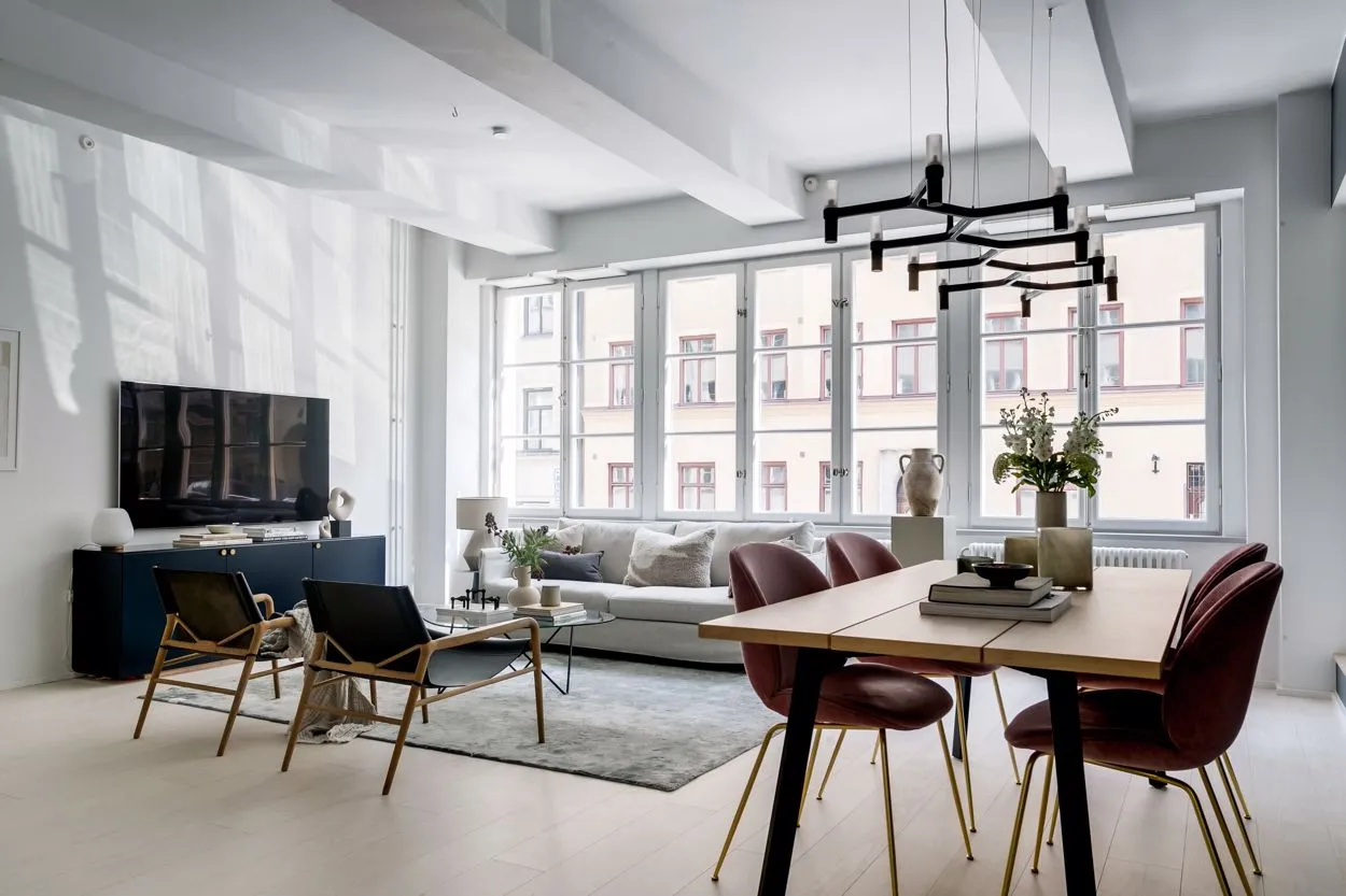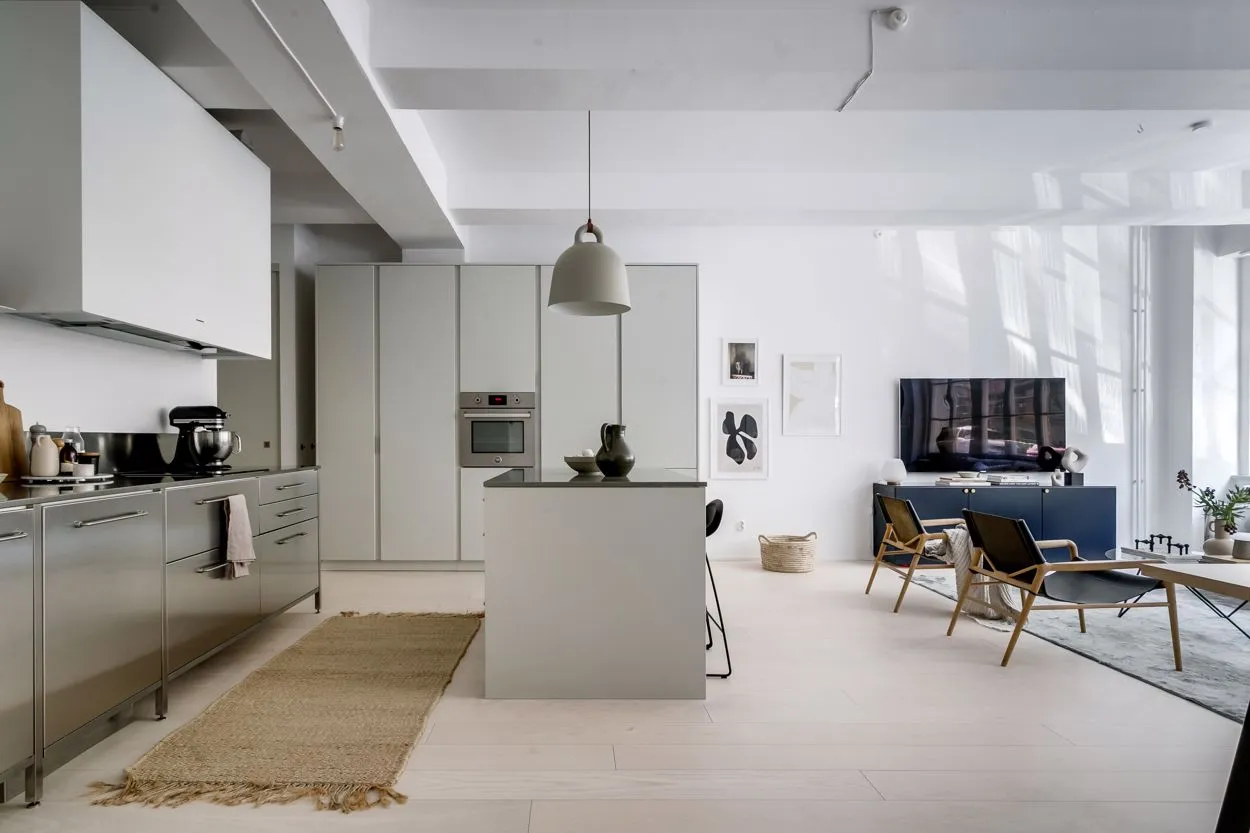 広々とした空間、自然光、工業用の窓、そして高い天井——これらはストックホルムにあるこのアパートが古いチョコレート工場から受け継いだ特徴です。その工場の跡地に今ではユニークな住宅ビルが建っています。
