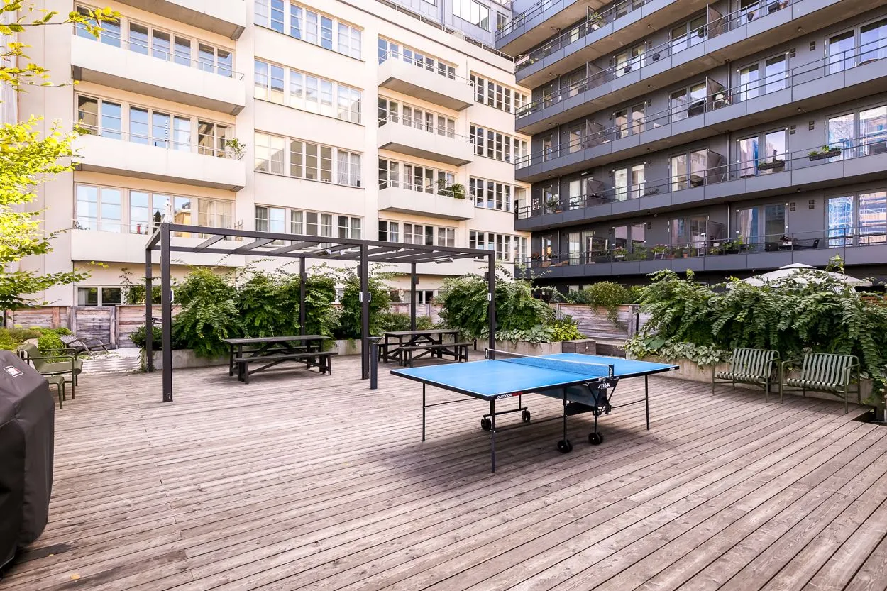 ストックホルムの旧チョコレート工場の建物内にある、広いバルコニー付きのスタイリッシュなロフト(83平方メートル)