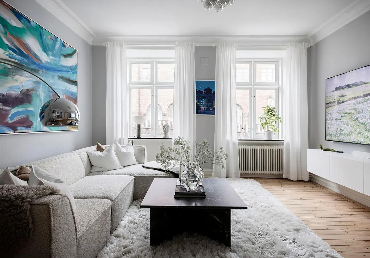 スウェーデンにある美しい小さな2ルームアパートメント。リビングルームは部屋を貫通しています(面積:49平方メートル)。
