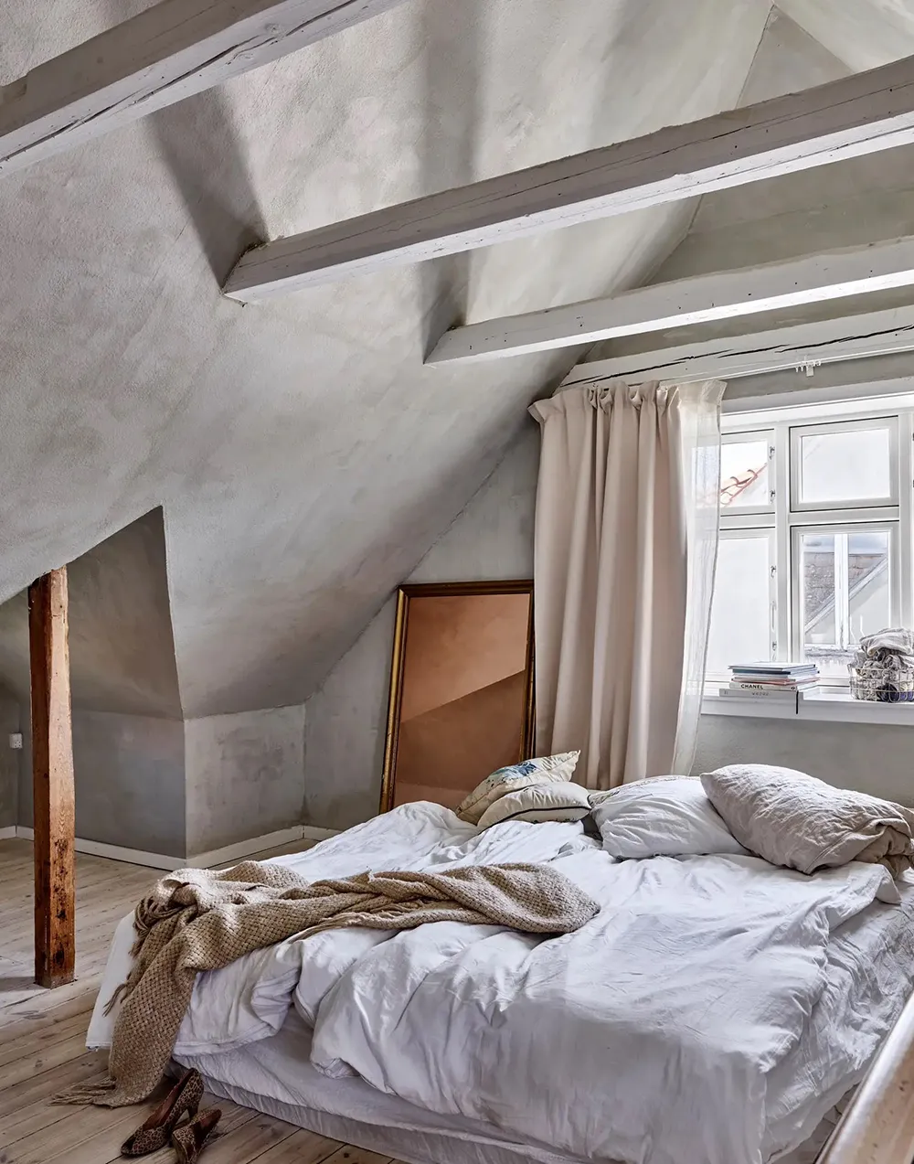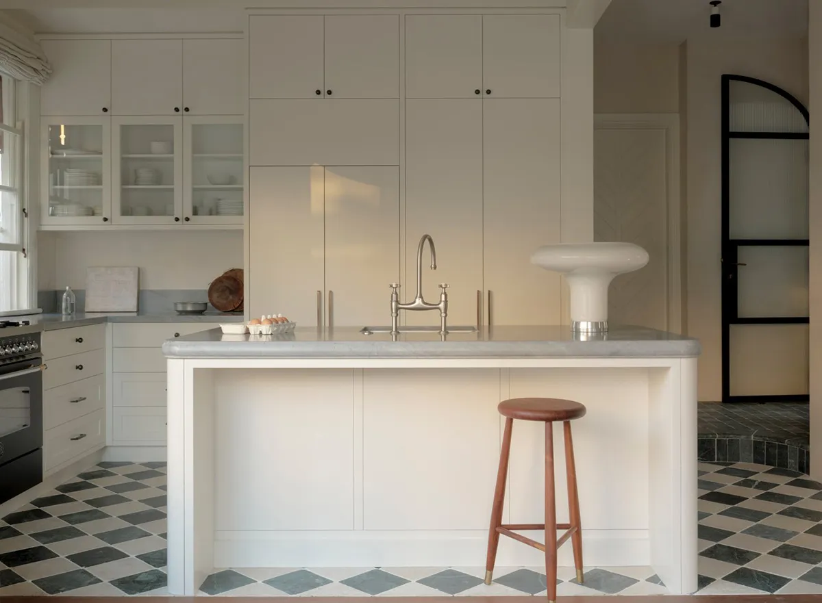 ノルマンディー海岸にある歴史的なヴィラの、上品でミルクホワイトの内装