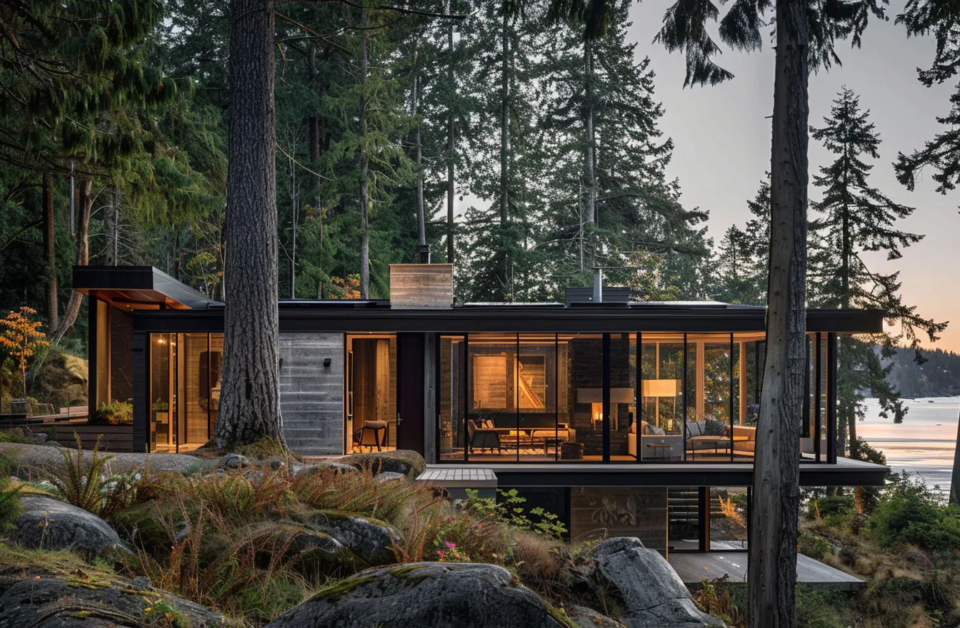 スウェーデンの森にある小高い丘の上にコンクリートとガラスで建てられたこの壮麗なモダンな湖畔の家は、文字通り地元の自然と一体となっています。