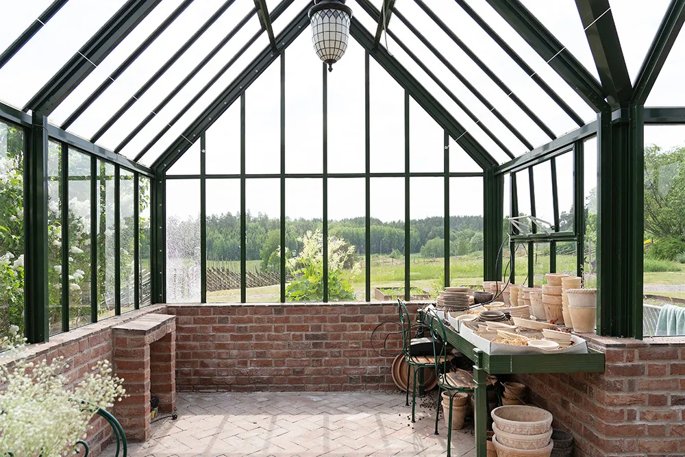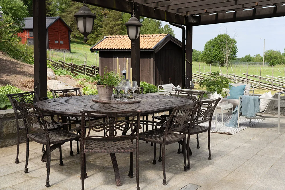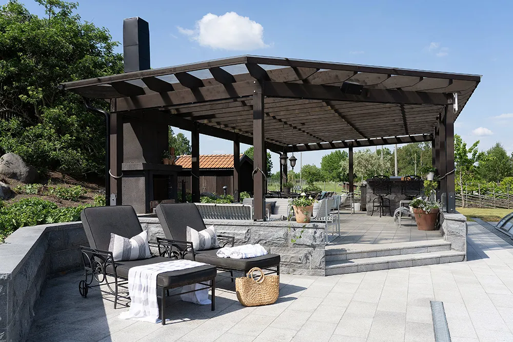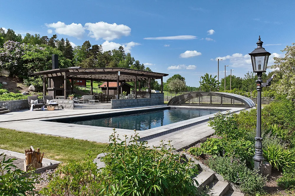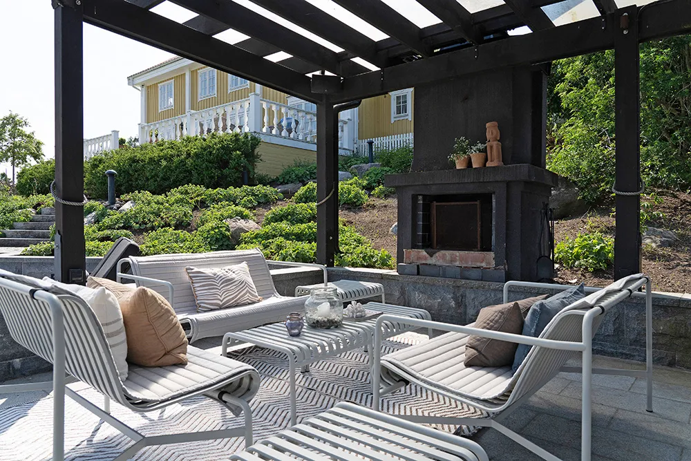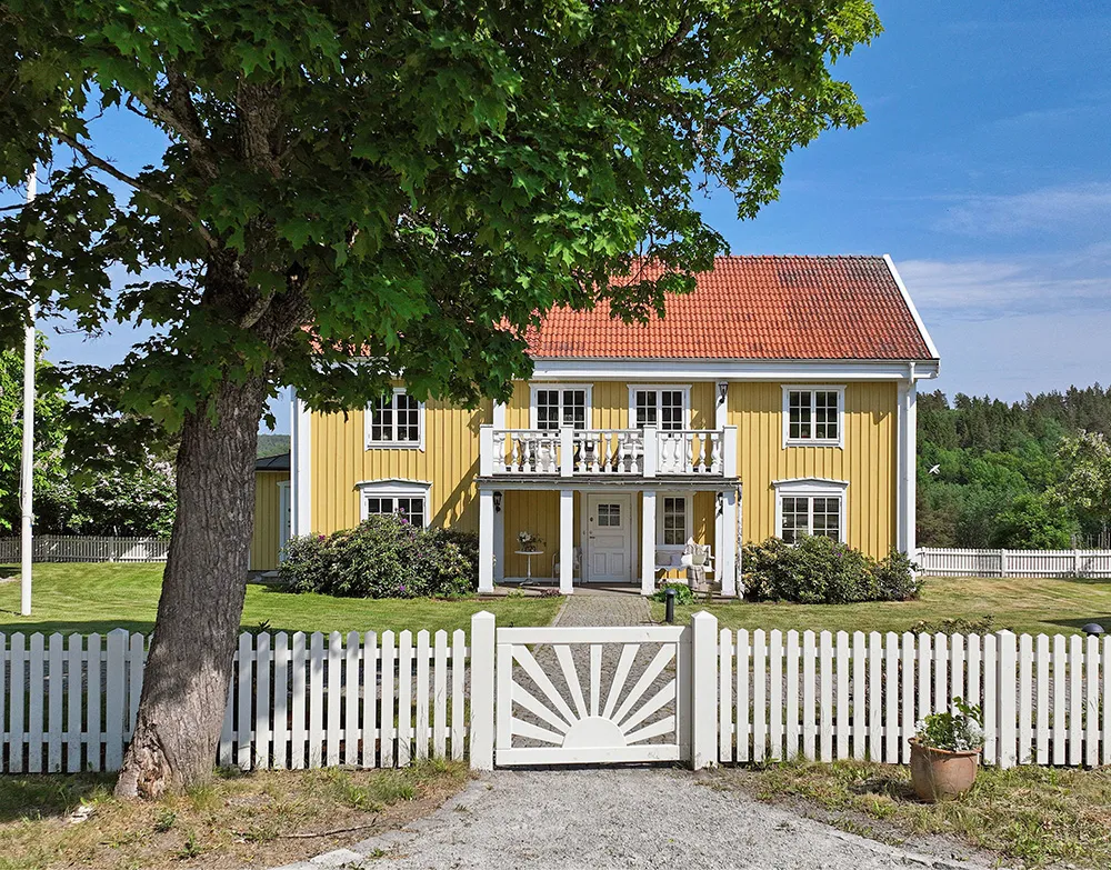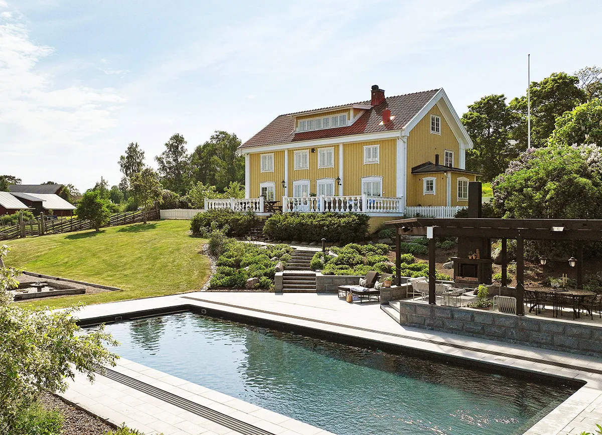 スウェーデンにある、テラスとプール付きの美しい黄色いヴィラ